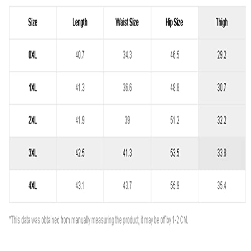 4X-Large Plus: Length: 43.1", Waist Size: 43.7", Hip Size: 55.9", Thigh: 35.4"
