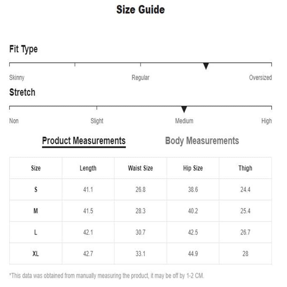Details: Size Chart: Small: Length: 41.1", Waist Size: 26.8", Hip Size: 38.6", Thigh: 24.4" Medium: Length: 41.5", Waist Size: 28.3", Hip Size: 40.2", Thigh: 25.4" Large: Length: 42.1", Waist Size: 30.7", Hip Size: 42.5", Thigh: 26.7" X-Large: Length: 42.7", Waist Size: 33.1", Hip Size: 44.9", Thigh: 28.0"