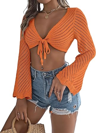 Beautiful Nomad Women's Crochet Cardigan Tie Front Bell Long Sleeve Knit Sweater Hollow Out Shrug Top