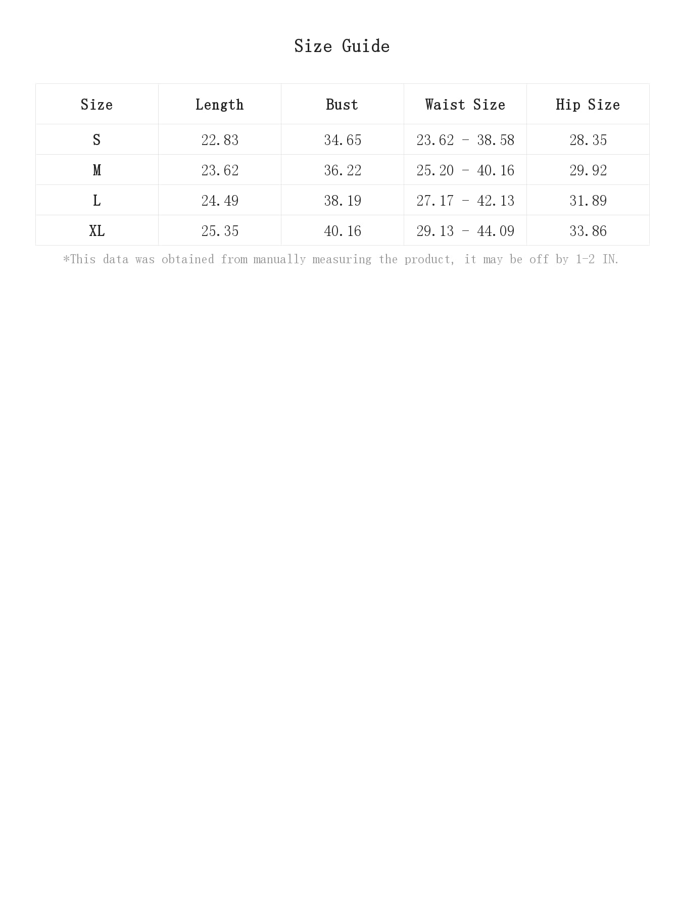 XL:Bust:40.2IN,Hip Size:33.9IN,Length:25.4IN,Waist Size:29.1-44.1IN