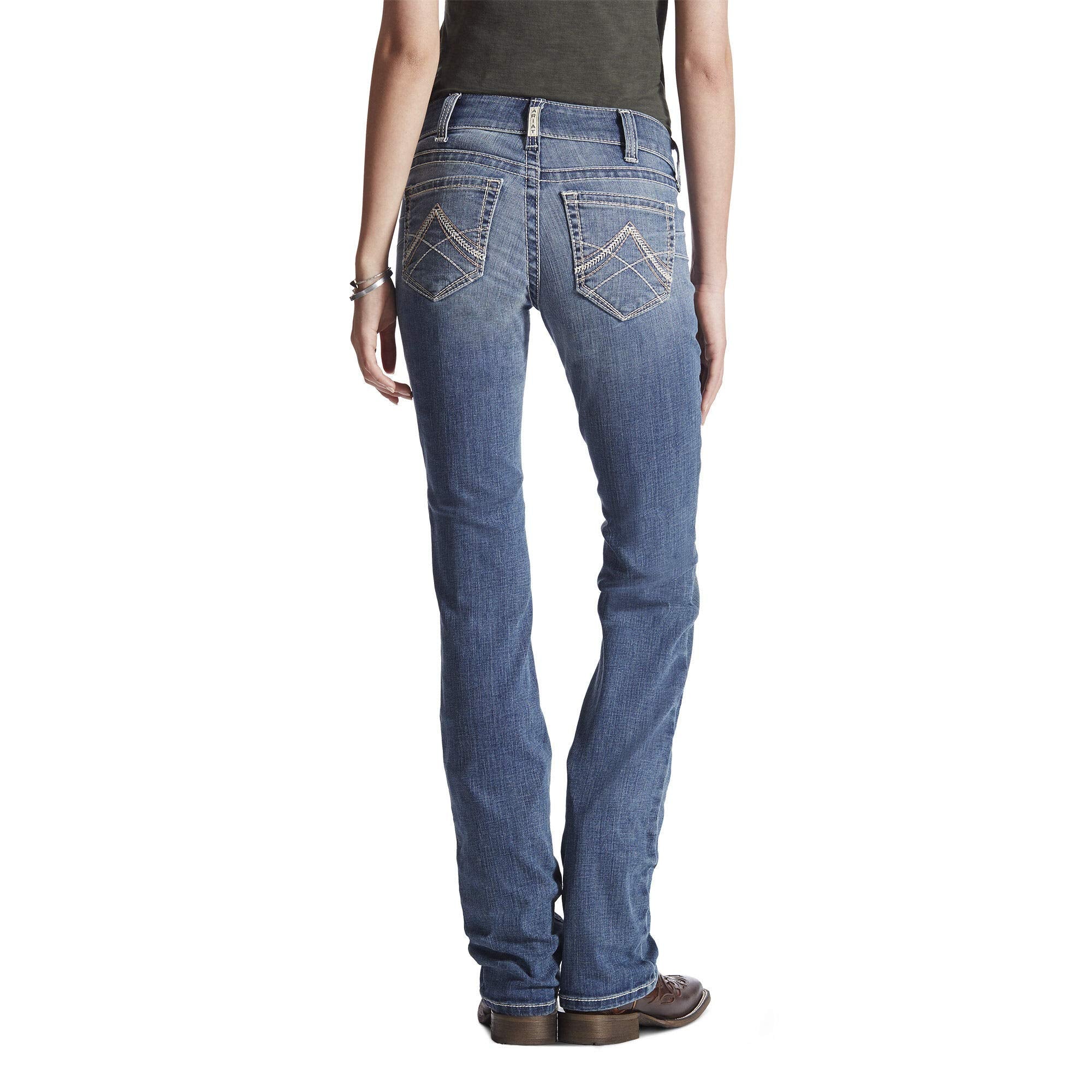 Details: Ariat® Women's Size Guide Ariat® Men's Size Guide Be impressed by your backside and make your moves onto the dance floor in these attractive Ariat® R.E.A.L. Straight Icon Jeans. Stretchy mid-rise pant is straight through the seat and thigh with a stackable boot cut cuff that easily goes over the boots. Tinted medium-washed denim boasts heavy hand sanding, tacking, and contrast stitching. Fixed belt loop waist. Zip fly and button closure. Classic five-pocket design. Multi-dimensional stitching with locker loop details along rear pockets. 92% cotton, 6% polyester, 2% spandex. Machine wash, line dry. Imported. Measurements: Waist Measurement: 28 in Outseam: 40 in Inseam: 31 in Front Rise: 9 in Back Rise: 12 in Leg Opening: 16 in Product measurements were taken using size 26, inseam R. Please note that measurements may vary by size.