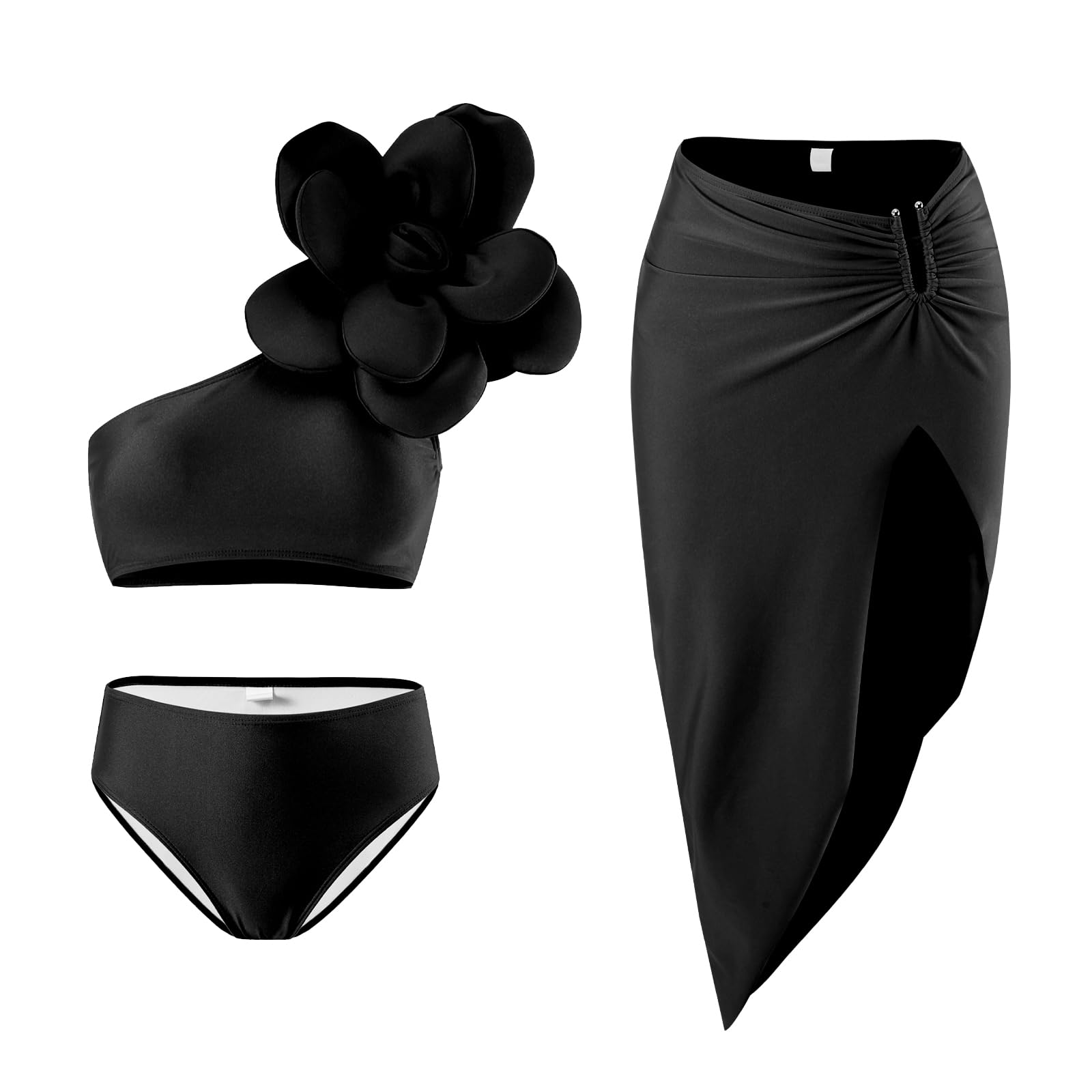 • Women Swimsuit Set: Top features a large 3D flower in the fronton the left shoulder, chest area is padded for enhanced comfort and support, high-waisted bottom offers a trendy and retro-inspired look, hip cover skirt decorated with a "U" shaped metel with pleated design, adding texture and visual interest to the swimsuit ensemble, elevating its overall appeal.