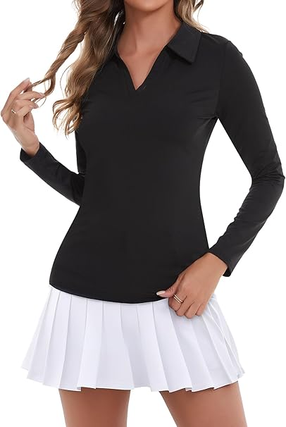 SHAPERIN Women's Golf Polo Shirt Long Sleeve Collared V Neck Sun Protection Quick Dry Athletic Workout Tops Tennis Shirt