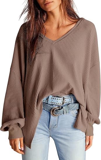 Dokotoo Womens Waffle Knit Tops 2024 Fashion Long Lantern Sleeve Casual Blouses V Neck Oversized T Shirts