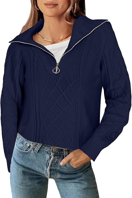 Tanou Women's Quarter Zip Pullover Sweater Collar Neck Long Sleeve Cable Knit Sweaters Casual Loose Fall Tops