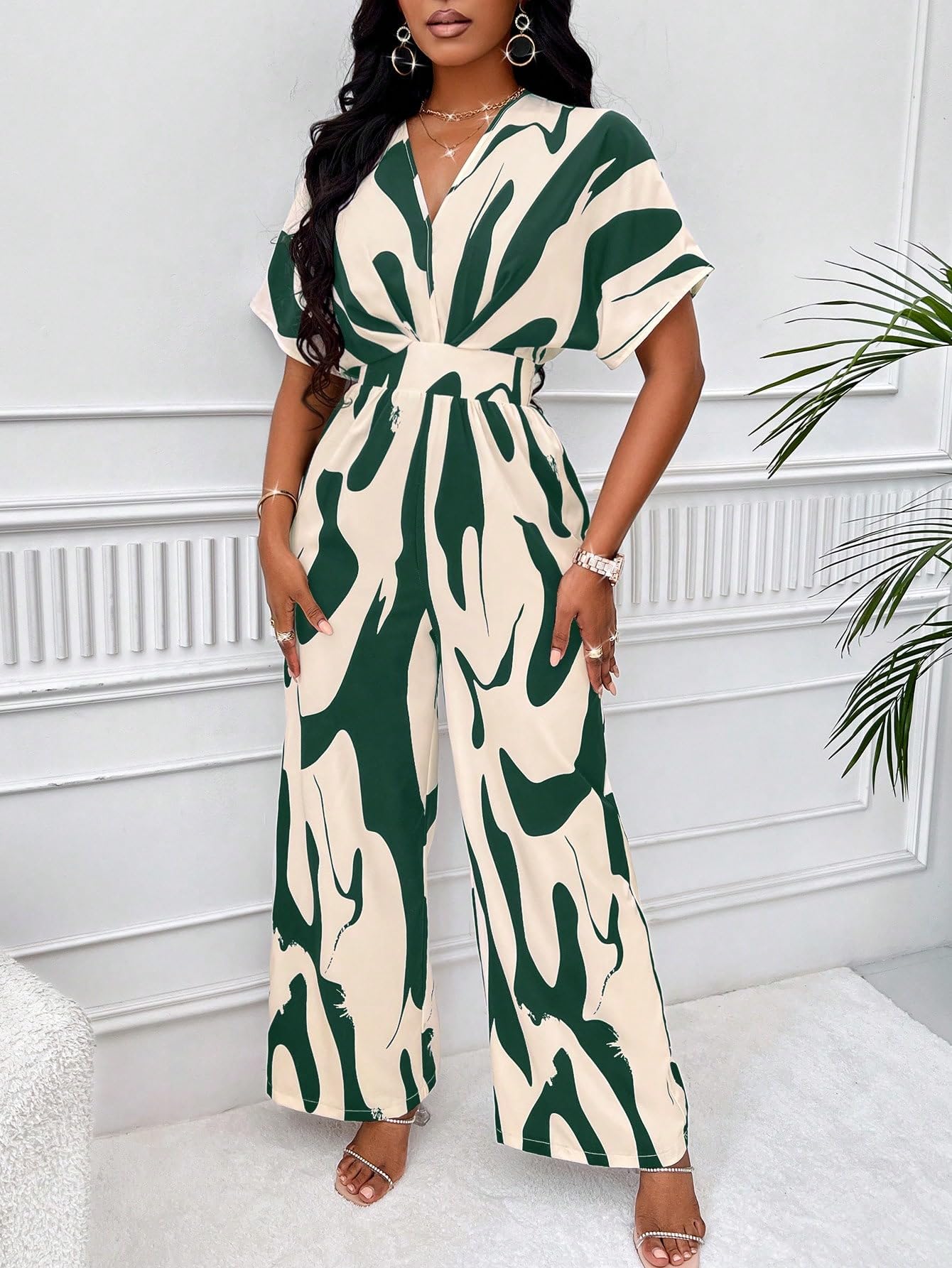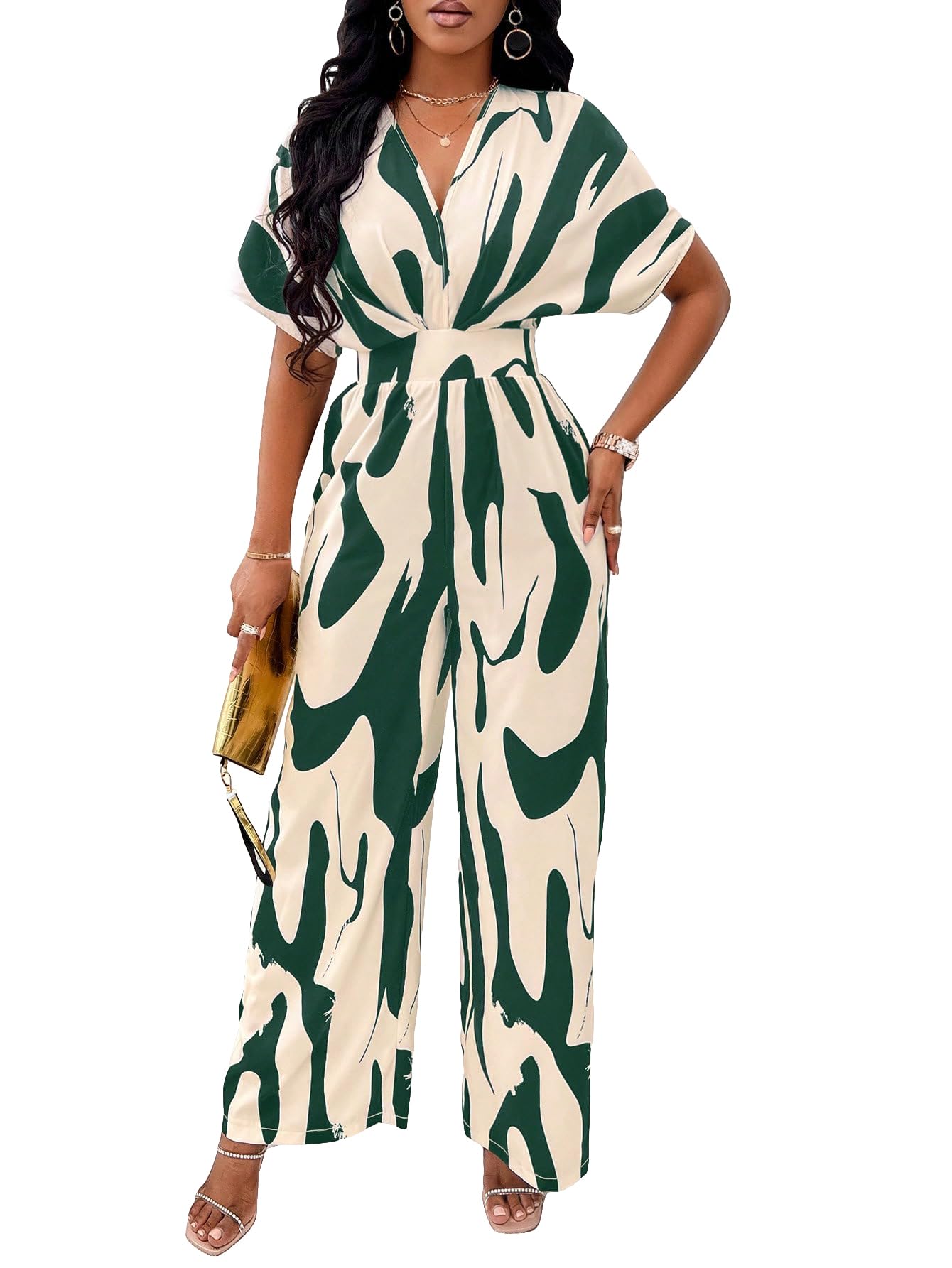 • Features: abstract print, belted, v neck, short sleeve, high waisted, casual wide leg jumpsuits for women
