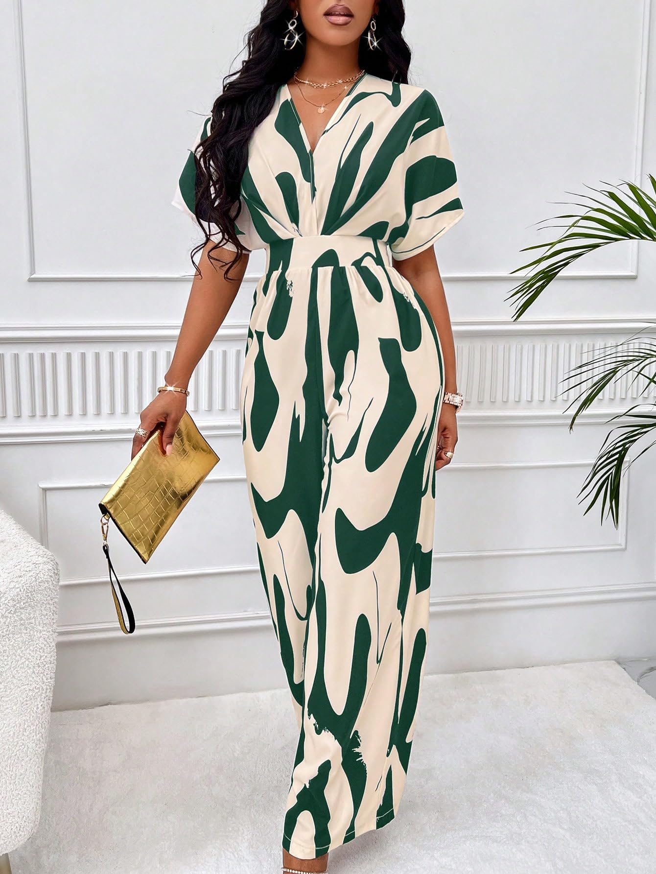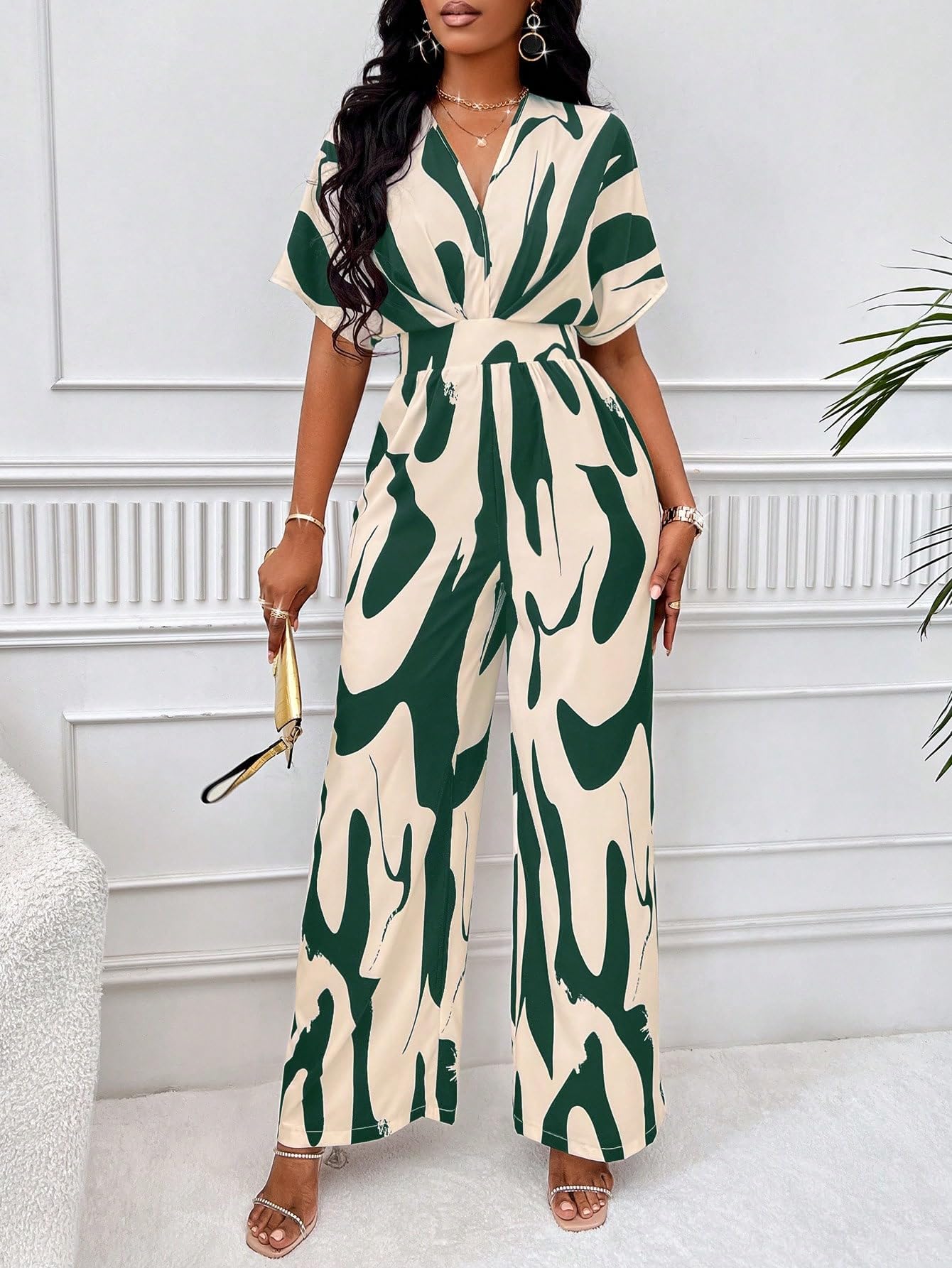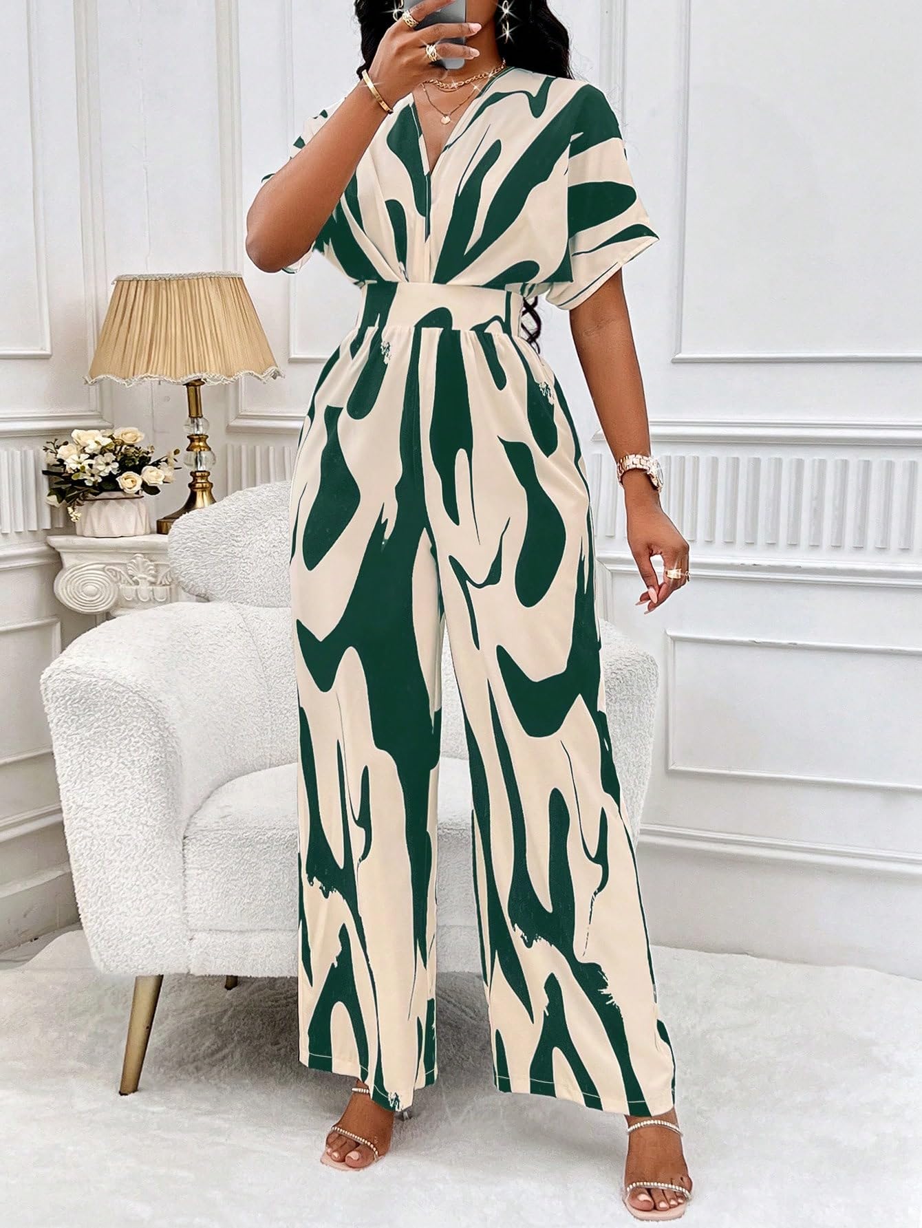 WDIRARA Women's Abstract Print Ruched Belted Wide Leg Jumpsuits V Neck Short Sleeve High Waisted Casual Rompers Pants Green Large