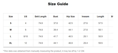 Large: Belt Length: 74.8", Bust: 41.7", Hip Size: 46.5", Inseam: 28.1", Length: 58.9", Shoulder: 14.8", Thigh: 30.0", Waist Size: 29.9-43.3"