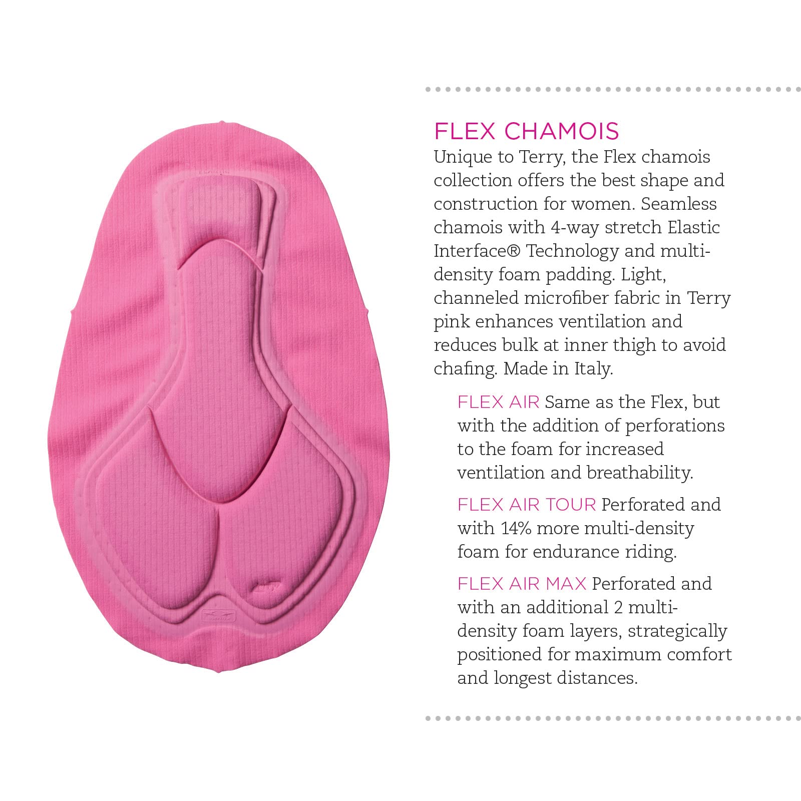 Flex Air Lite Chamois: Seamless chamois with 4-way stretch Elastic Interface Technology and a slightly reduced foam density, perforated for the maximum degree of ventilation and breathability. Light, smooth microfiber fabric and Terry's signature soft-wing construction reduces bulk at inner thigh to avoid chafing. Made in Italy.