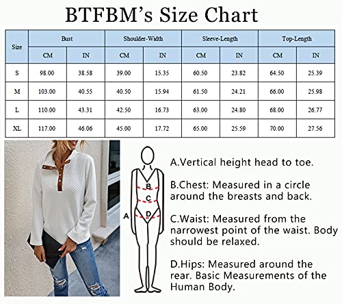 Details: BTFBM Women’s Quilted Panel Long Sleeve Zip Up Loose Fit Solid Color Soft Lightweight Sweatshirts Pullovers Tops Shirts with Front Kangaroo Pocket Fashionable Sweatshirt Look by Brand BTFBM High Quality Stretch Cotton Blend Sweatshirt Fabric Kangaroo Pocket, Ribbed Cuffs Eye-Catching Quilted Panel BTFBM Women Long Sleeve Collar Sweatshirt Pocket Pullover Loose Tunic Shirts Blouse Tops Product Description: Brand: BTFBM Gender:Women , Ladies , Girls Clothing Type: Women Casual Sweatshirt Material: 65% Polyester and 35% Cotton Pattern: Quilted Panel at the front Length: Regular-Length Closure: Zipper Closure Style: Unique / Fashion / Casual Fitness: Relaxed Fit Zipper: 1/4 Zipper / Zip Up Sleeves: Long Sleeve Pocket: Front Kangaroo Pocket Color: Dark Grey , Light Grey , Navy Season: Spring, Cold Summer, Autumn and Winter Unique Design: Sweatshirt at the front covers with Quilted Pattern Occasion: daily, casual wear, home, work, job, school, sports, running, hang out, shopping, party, holiday, travel, fashion street look Garment Include: 1 X BTFBM Women Quilted Sweatshirt BTFBM Women's Long Sleeve Casual Printed Sweatshirt Tops Blouses Shirts Pullovers Warm Soft Size Chart Please allow there is 2-3% difference according to manual measurement US S: Bust 96 CM/37.8"----Shoulder 37 CM/14.6"----Length 67 CM/26.4"----Sleeve 63.5 CM/25.0" US M: Bust 101 CM/39.8"----Shoulder 39 CM/15.4"----Length 68.25 CM/26.9"----Sleeve 64.75 CM/25.5" US L: Bust 108 CM/42.5"----Shoulder 41 CM/16.1"----Length 69.5 CM/27.4"----Sleeve 66 CM/26.0" US XL: Bust 116 CM/45.7"----Shoulder 43 CM/16.9"----Length 70.75 CM/27.9"----Sleeve 67.25 CM/26.5"