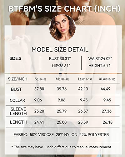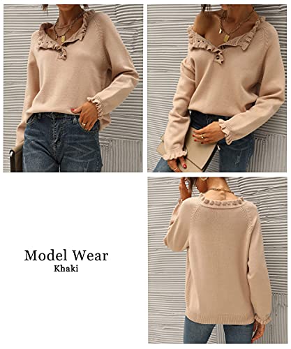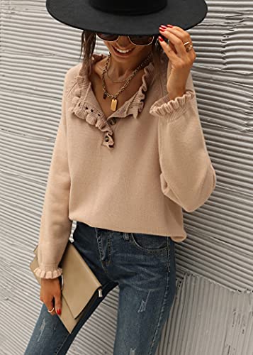 BTFBM Women's Sweaters Casual Long Sleeve Button Down Crew Neck Ruffle Knit Pullover Tops Solid Color Striped(Solid Khaki, X-Large)