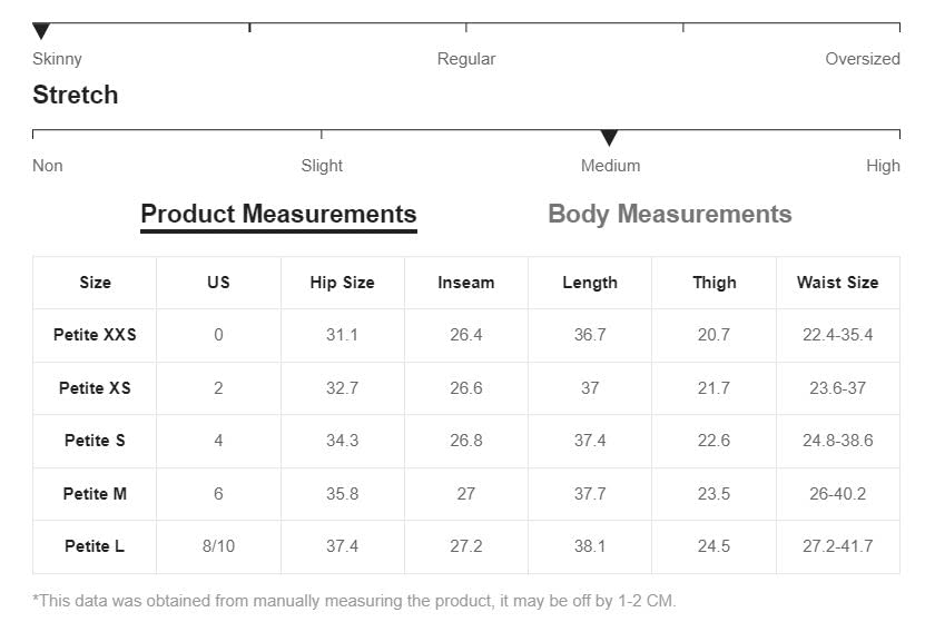 XX-Small | US: 0.0", Hip Size: 31.1", Inseam: 26.4", Length: 36.7", Thigh: 20.7", Waist Size: 22.4-35.4"