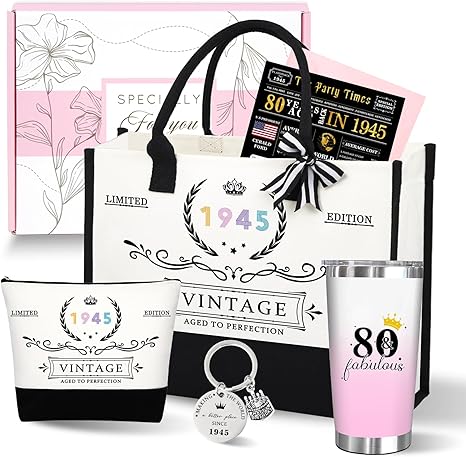 80th 1945 Birthday Gifts for Women, 80 Year Old Birthday Fabulous Gifts for Women, Cool 80th Gift Canvas Tote Bag Set for Woman, Turning 80th Cup Gift Basket for Her Mom Sister Wife