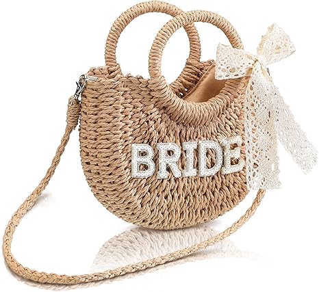 Pinkunn Bride Gift Bride Straw Purse Mrs Handwoven Bag Rhinestone Letter Bag Bachelorette Honeymoon Wedding Bridal Shower