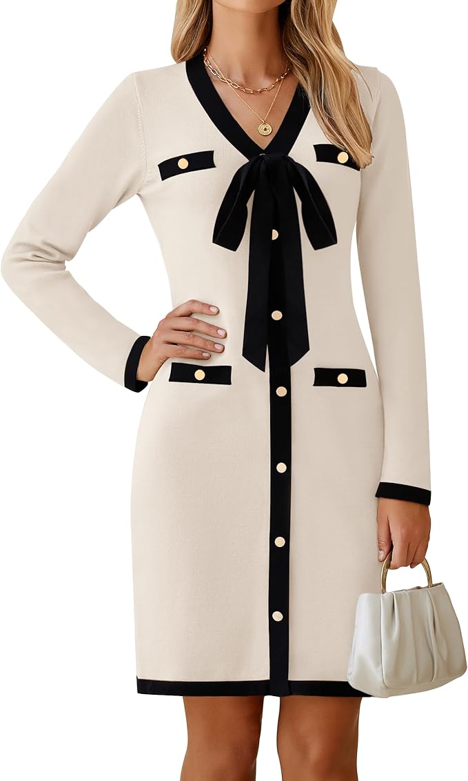 HAEOF Women's 2024 Long Sleeve Mini Sweater Dress Fall Winter Trendy V Neck Elegant Bodycon Formal Party Dresses