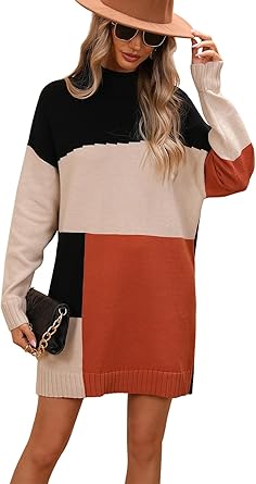 yoeasy Women's Color Block Knit Tunic Sweater Dress Crew Neck Long Sleeve Mini Tunic Pullover Sweater