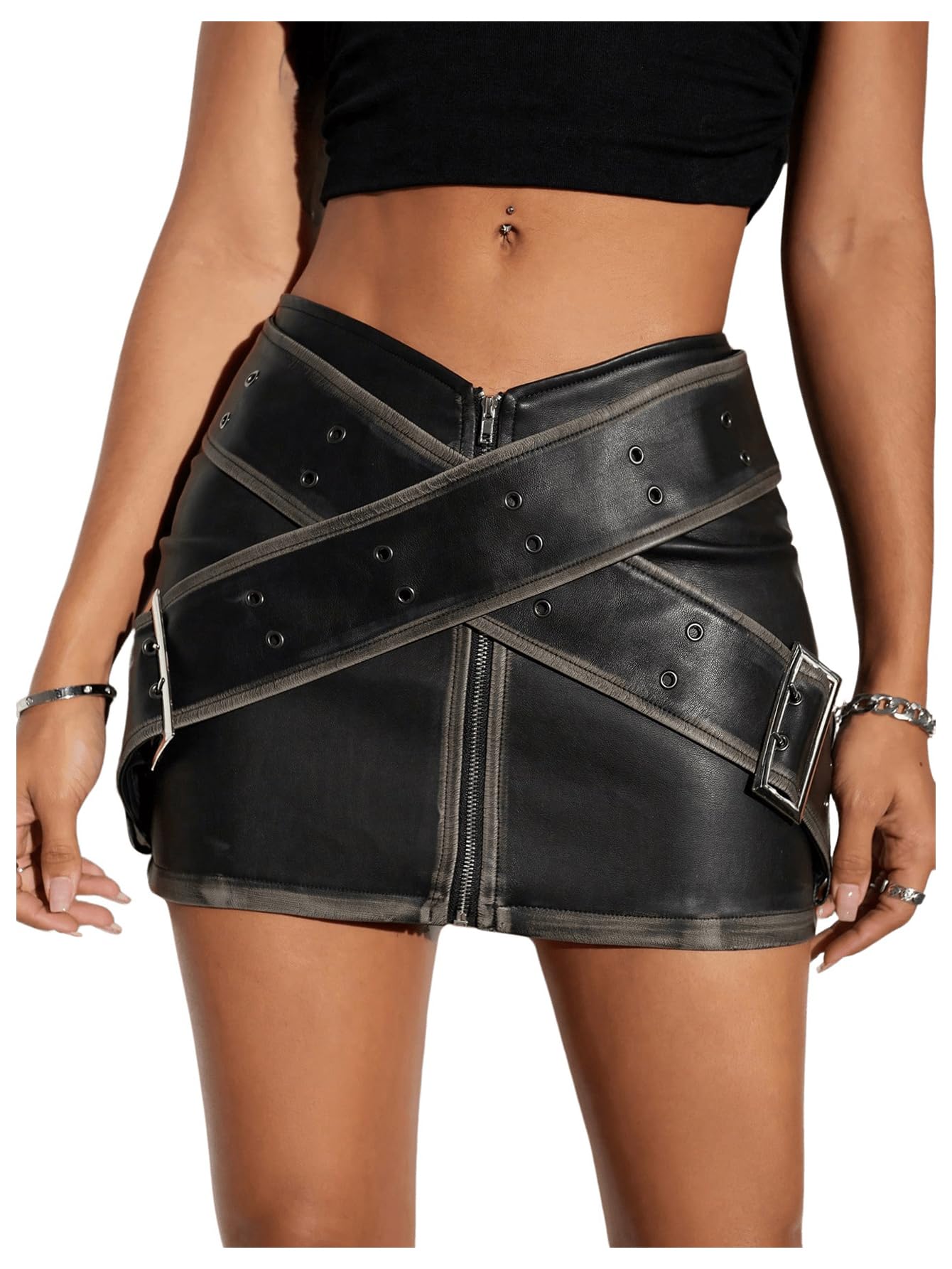 BEAUDRM Women's Y2K Low Waist Buckle Grommet Eyelet PU Leather Skirt Skinny Mini Skirt Zip Up Bodycon Skirt Party Black Medium
