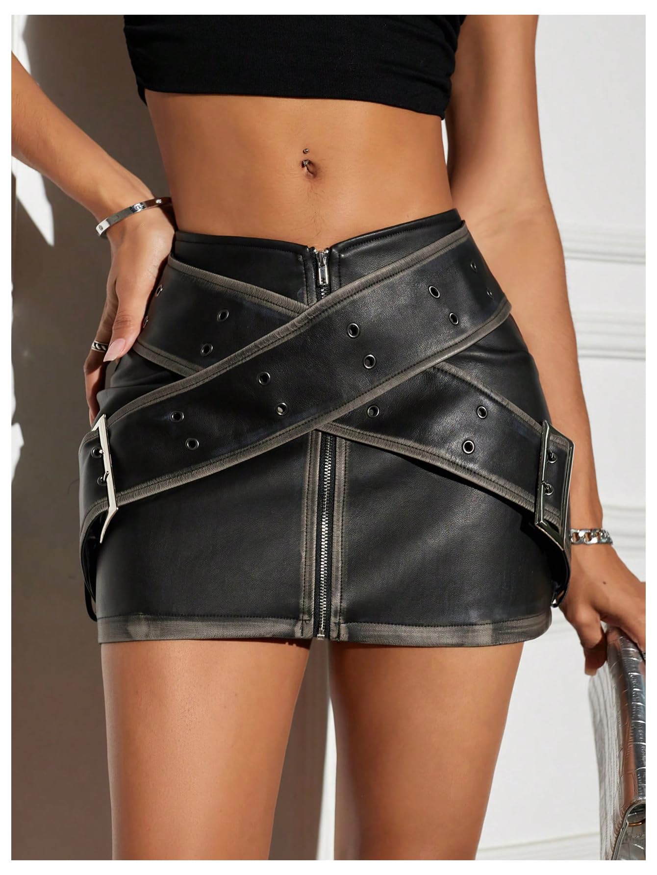 • Feature: Grommet eyelet, bodycon, zip fly, mini length, buckle decor, party skirt for women