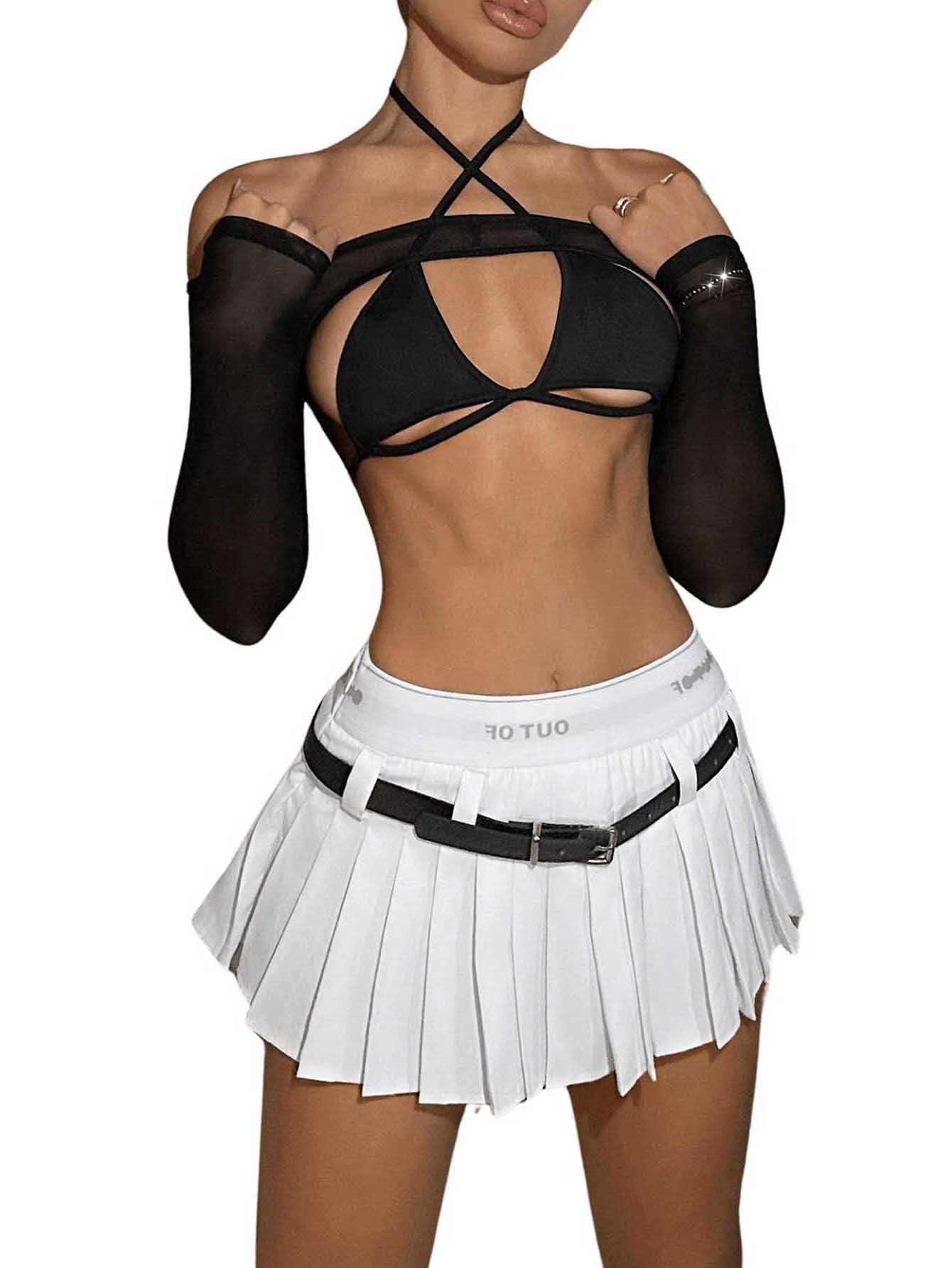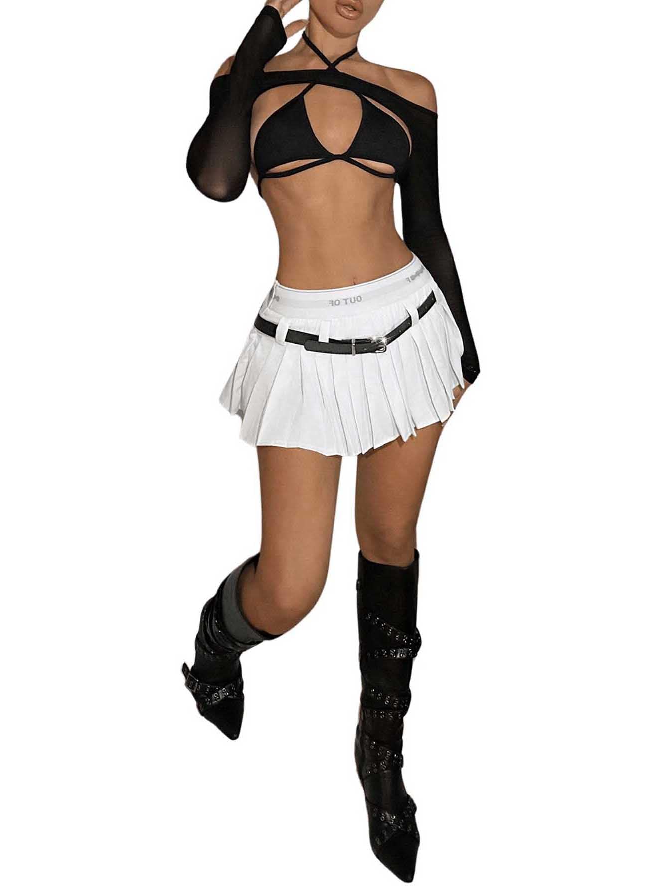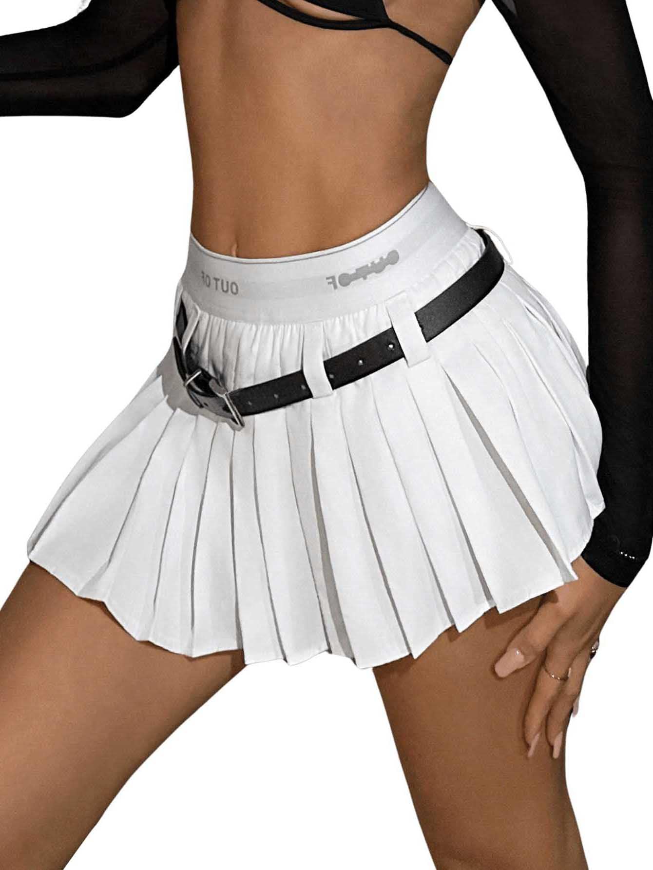 • Features: Low rise, pleated skirt, mini skirt, pu belted, loose fitted