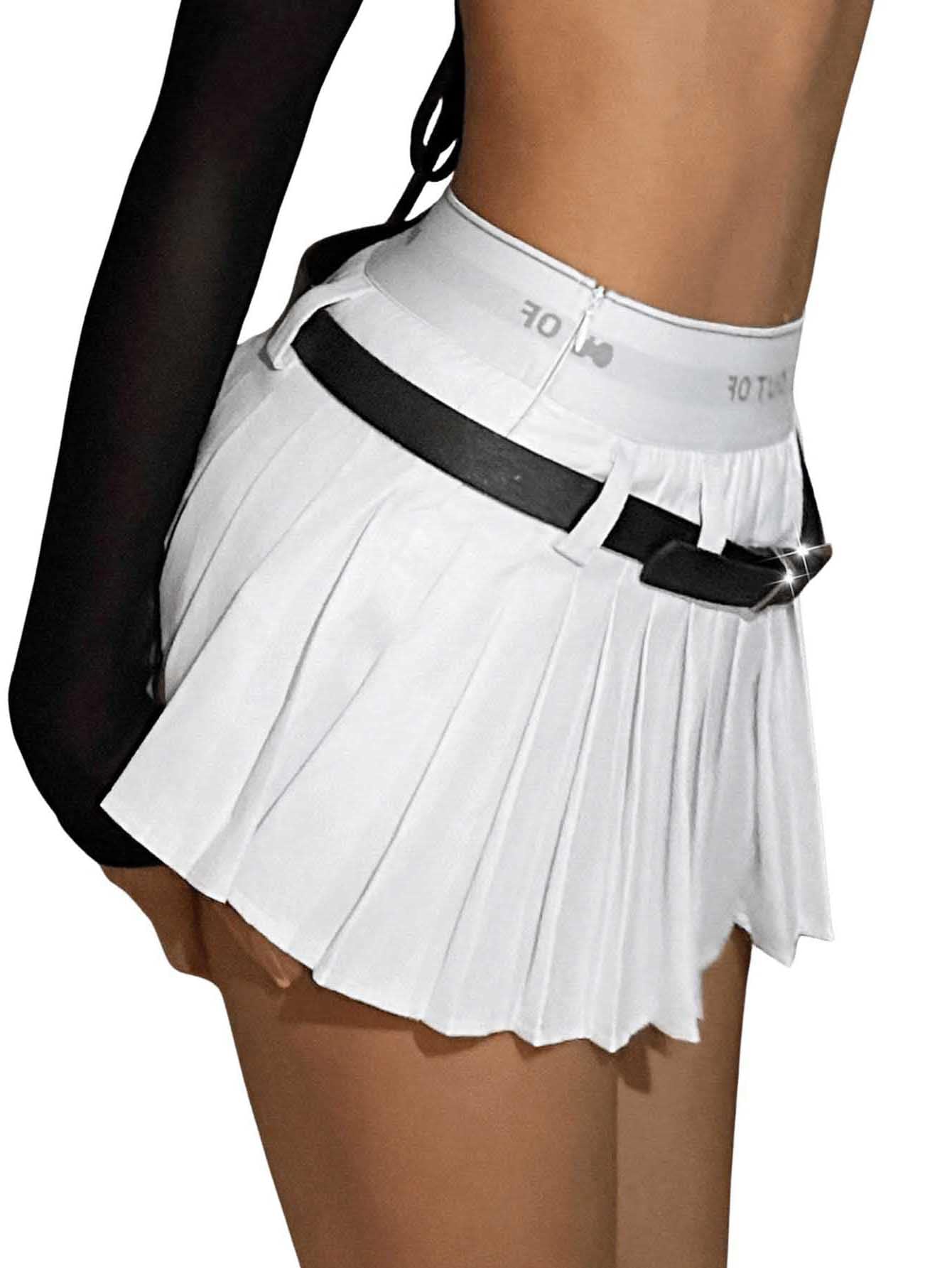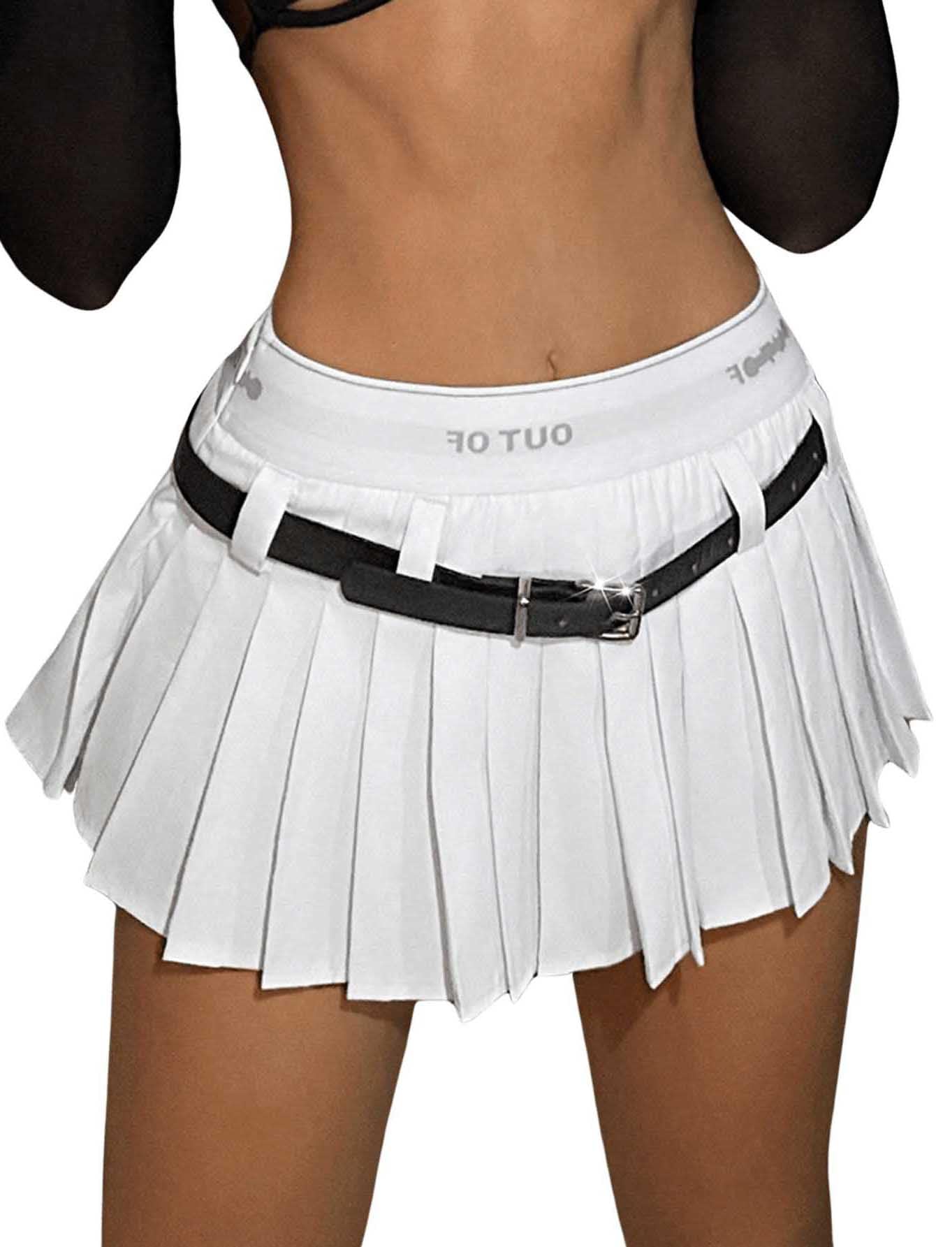 BEAUDRM Women's Y2K PU Belted Skirt Loose Pleated Mini Skirt Zip Up Ultra Low Waist Short Skirt with Belt White Medium