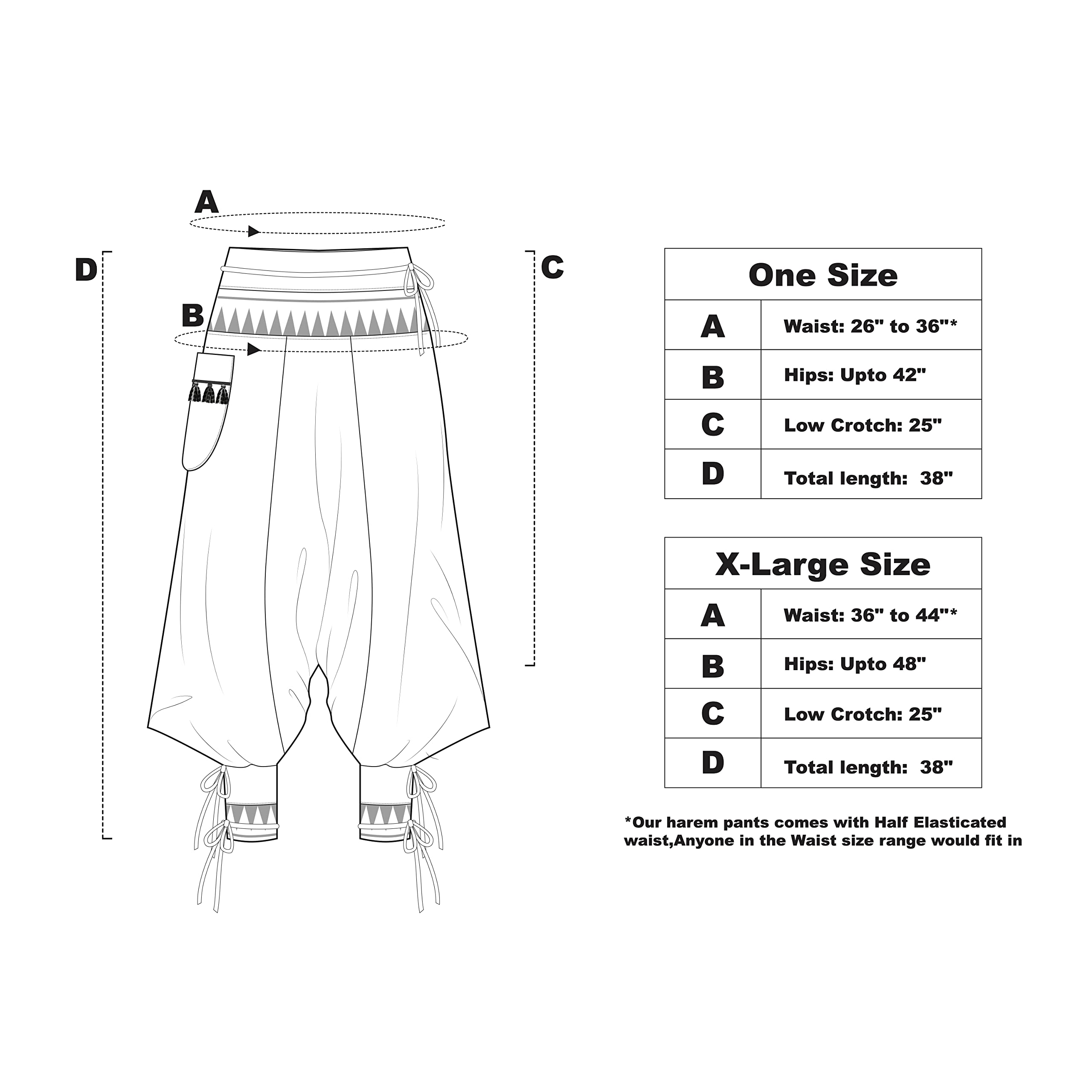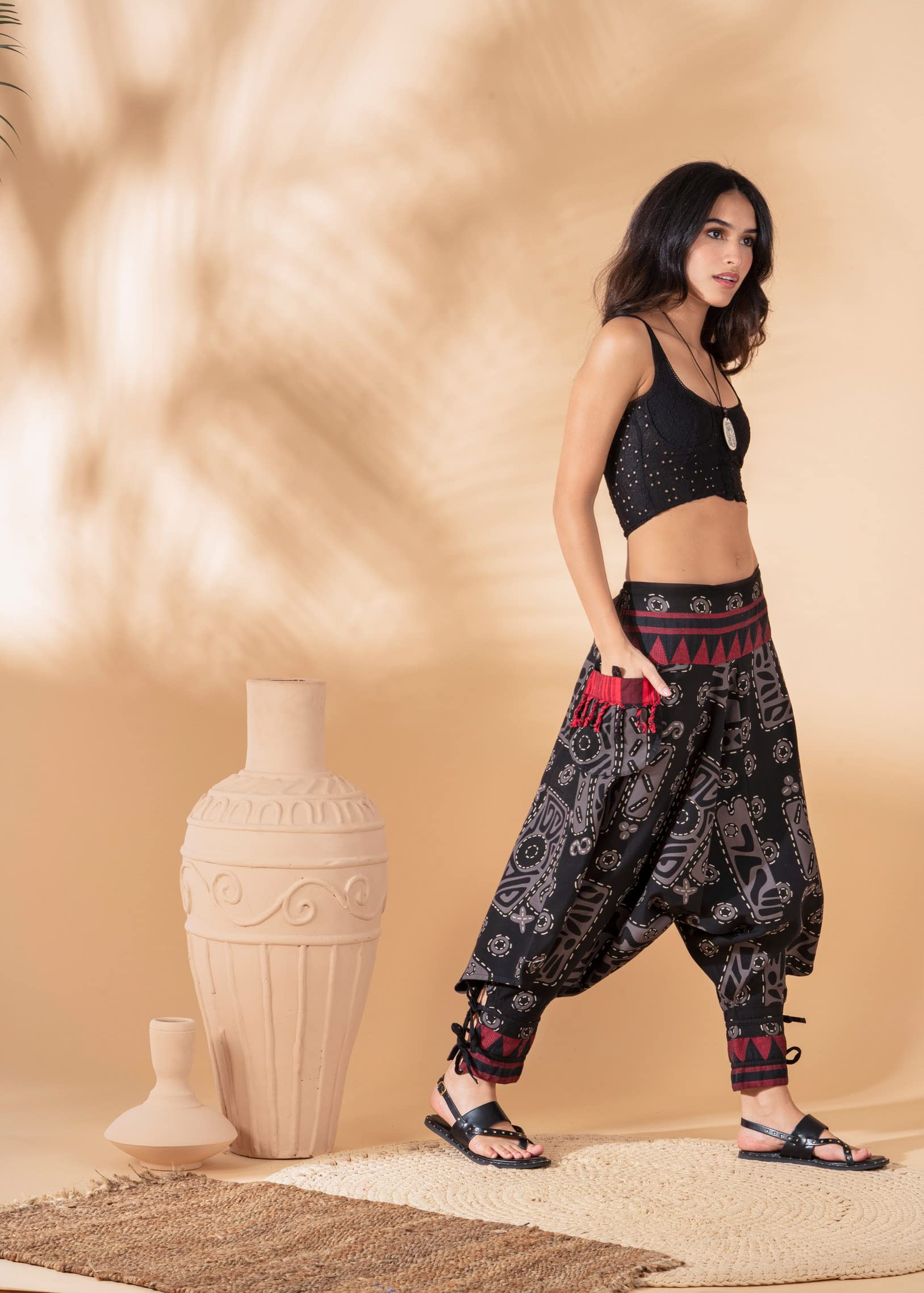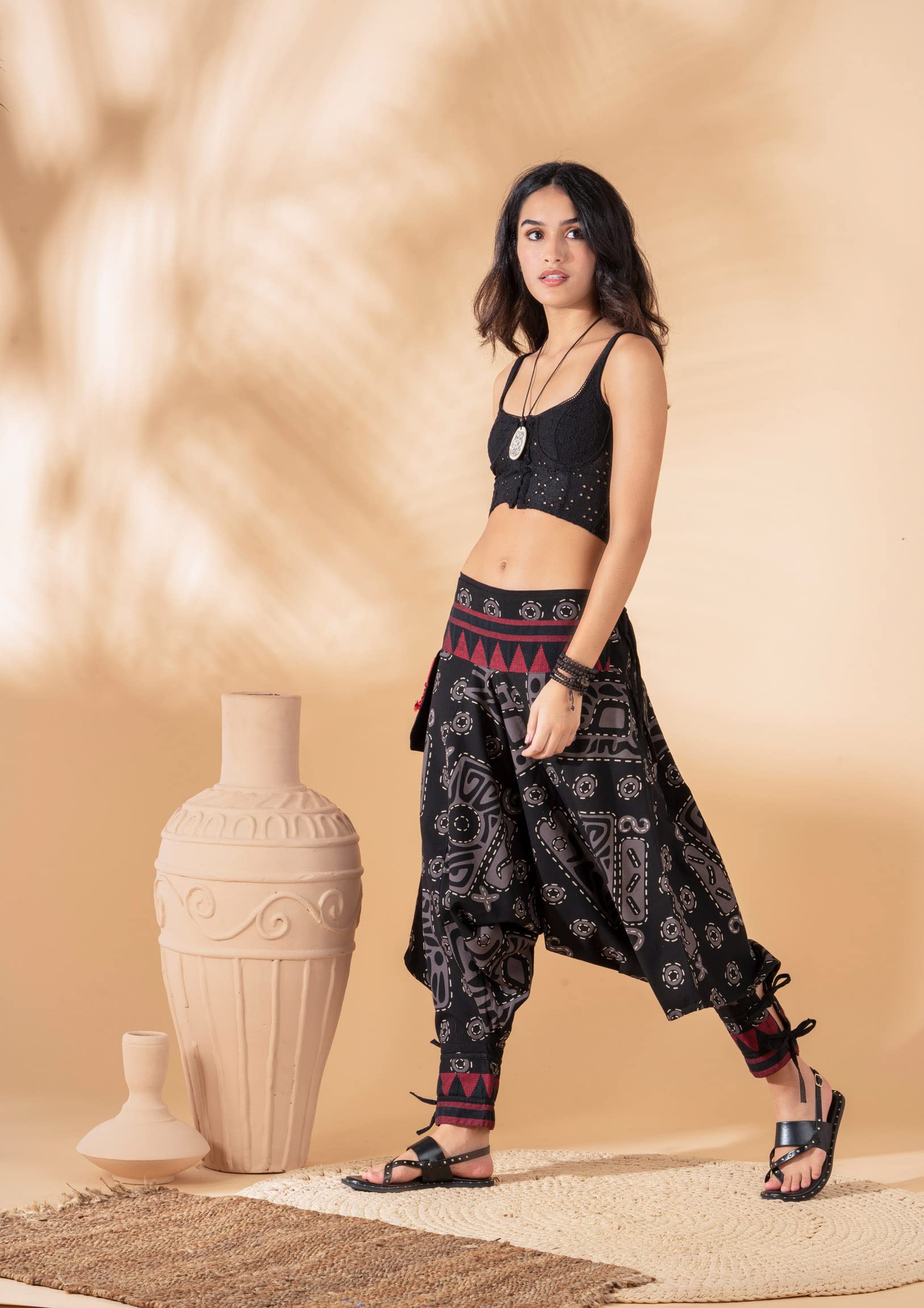 Details: The Unisex Bohemian Yoga Baggy Pants from the Veshti Company are must haves for women. They are made of long staple, super-combed 100% cotton. Their fabric is of premium quality and is breathable and comfy to wear. These hippie pants are lightweight and act as excellent summer jammies in hot, humid weather. The stylish pants work as mens joggers and women’s sports & recreation pants; they feature a half-elasticated waist that gives a slim tummy look. The harem pants for men and women come in two sizes - Free Size Waists (28" - 36”) and Plus Size Waists (36" - 44"). These womens pajama pants have super-size side pockets that are ideal for keeping mobiles, chapstick, keys, etc. The elaborate and ethnic graphic prints lend these baggy pants their bohemian aesthetic appeal. The comfortable, unisex design allows both men and women to use them for performing yoga, pilates, zumba, and dance. The baggy pants can also be worn at beach or pajama parties, function as travel or loungewear essentials. These men and women harem dhoti pants are the perfect gifts for Birthdays, Anniversaries, Slumber Parties, Thanksgiving, Christmas, and more.