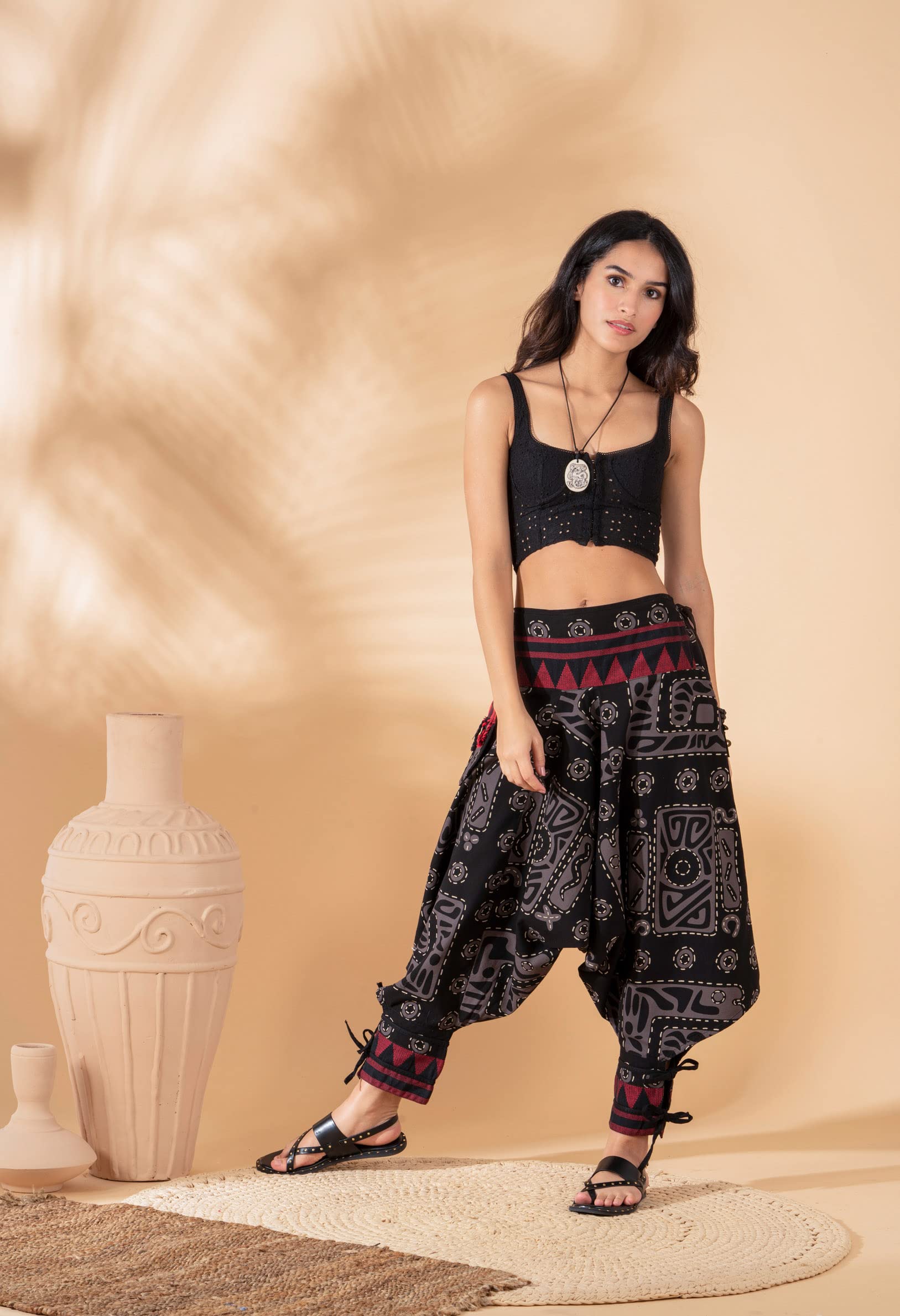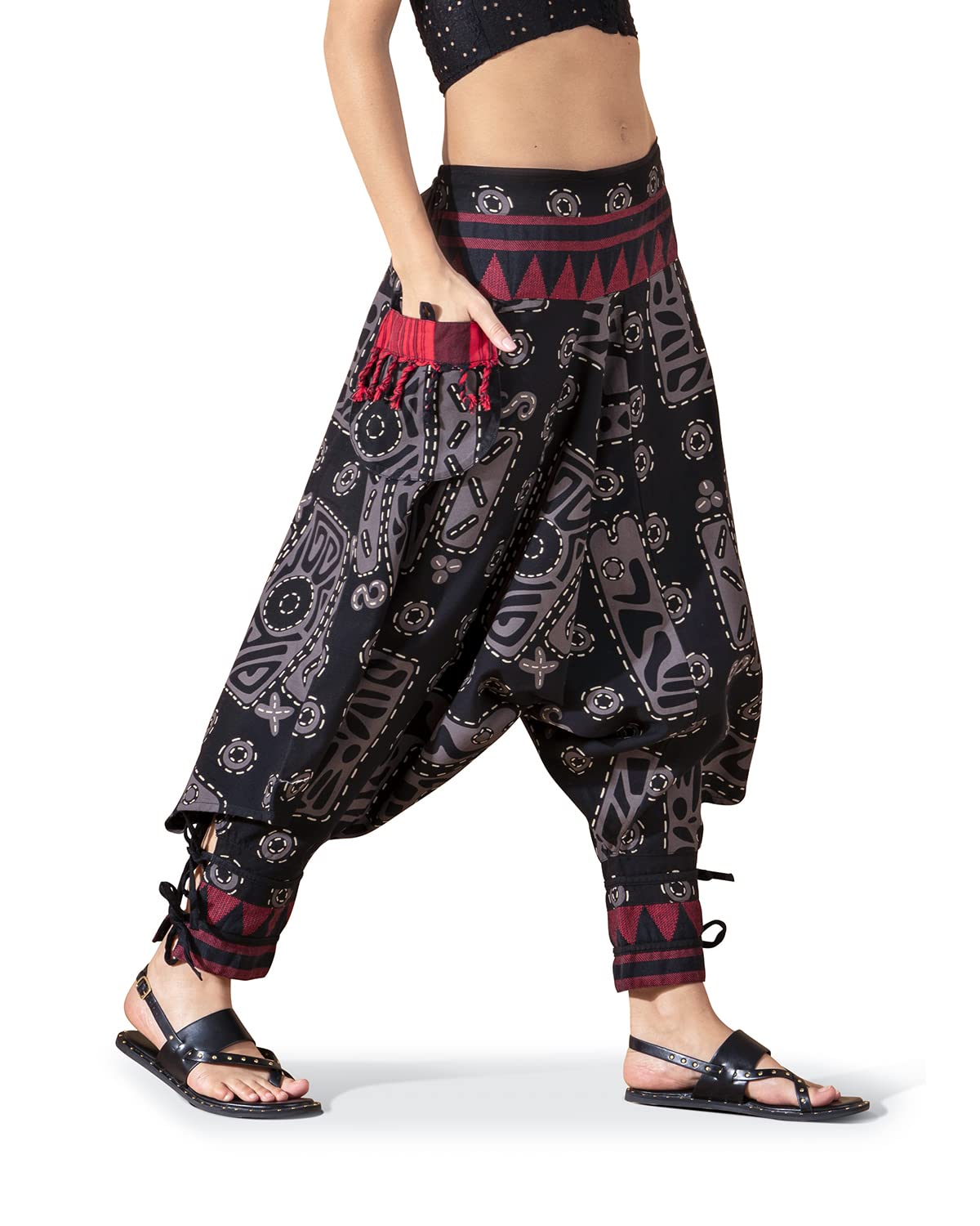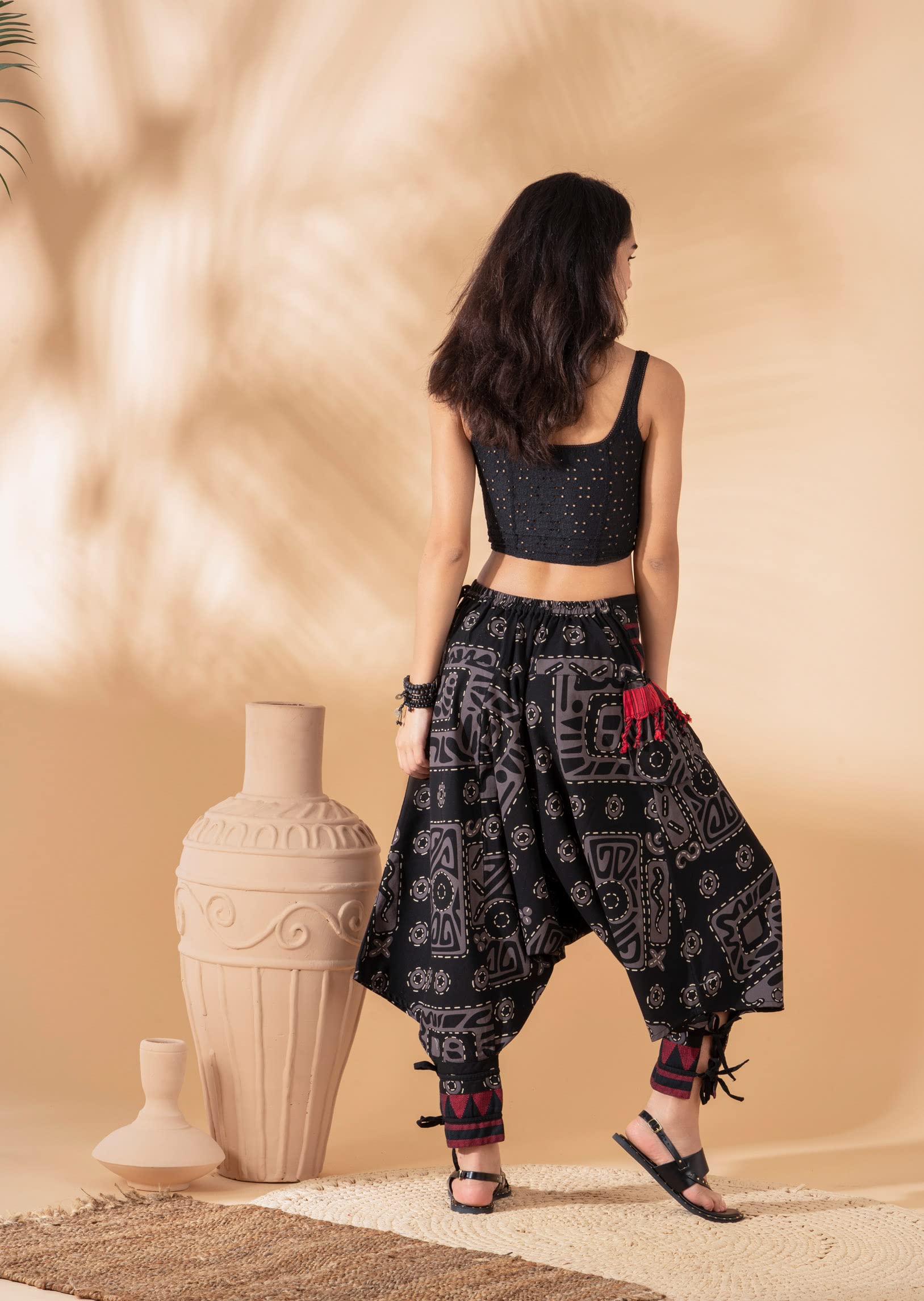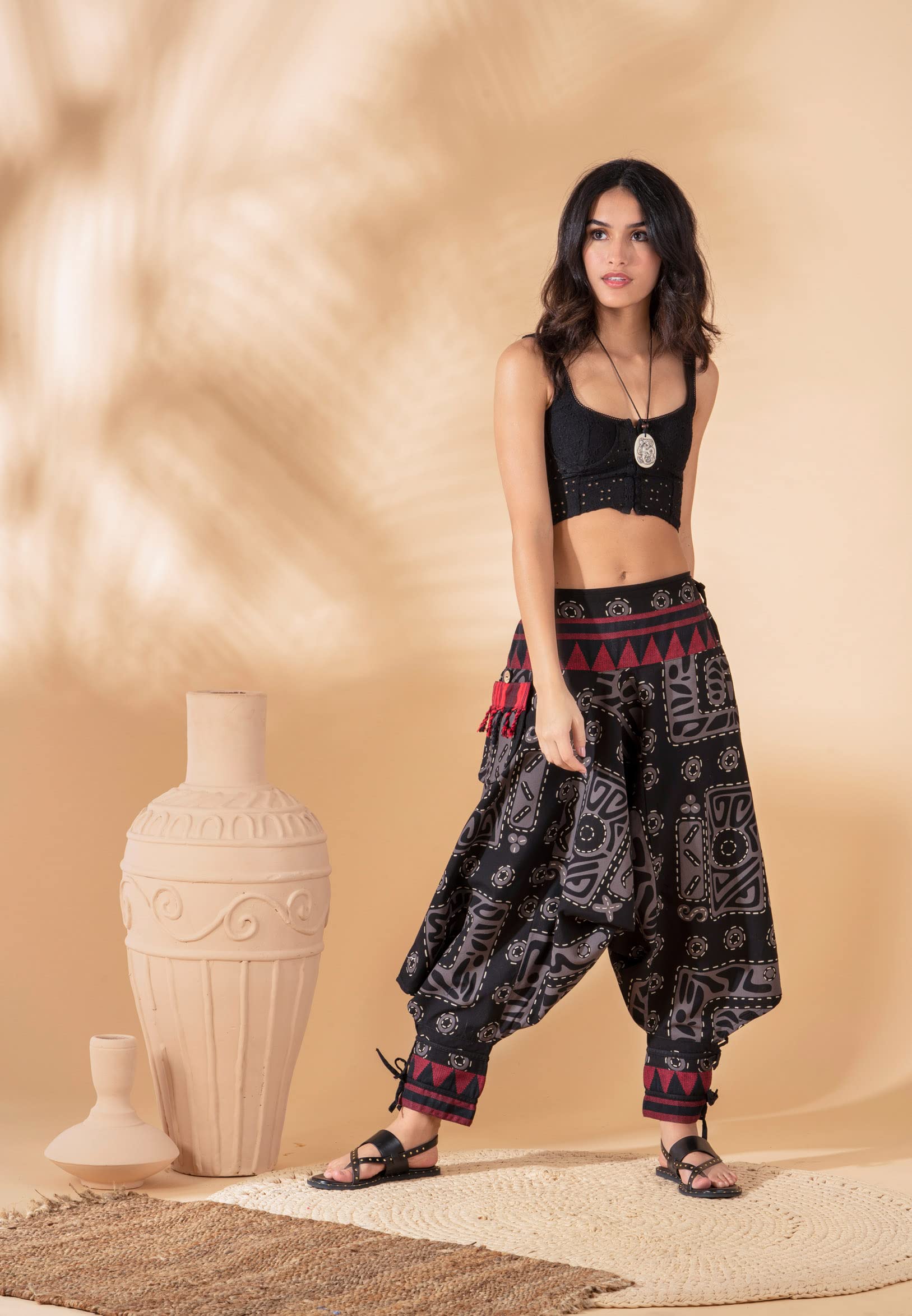 Details: The Unisex Bohemian Yoga Baggy Pants from the Veshti Company are must haves for women. They are made of long staple, super-combed 100% cotton. Their fabric is of premium quality and is breathable and comfy to wear. These hippie pants are lightweight and act as excellent summer jammies in hot, humid weather. The stylish pants work as mens joggers and women’s sports & recreation pants; they feature a half-elasticated waist that gives a slim tummy look. The harem pants for men and women come in two sizes - Free Size Waists (28" - 36”) and Plus Size Waists (36" - 44"). These womens pajama pants have super-size side pockets that are ideal for keeping mobiles, chapstick, keys, etc. The elaborate and ethnic graphic prints lend these baggy pants their bohemian aesthetic appeal. The comfortable, unisex design allows both men and women to use them for performing yoga, pilates, zumba, and dance. The baggy pants can also be worn at beach or pajama parties, function as travel or loungewear essentials. These men and women harem dhoti pants are the perfect gifts for Birthdays, Anniversaries, Slumber Parties, Thanksgiving, Christmas, and more.