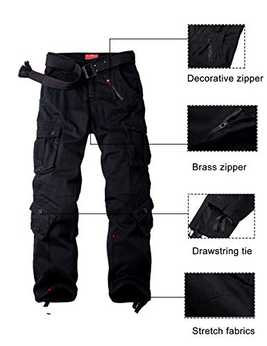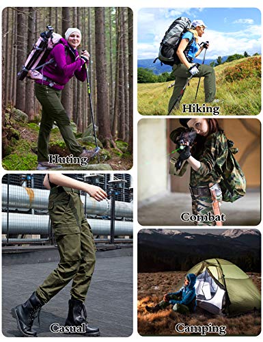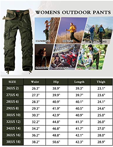 Details: Women's Tactical Combat Cargo Pants Ladies Casual Loose Fit Camouflage Muklti Pockets Trousers. Product Features: -Material: 100% Cotton, lightweight and breathable, it is more comfortable to wear. -Multi-pocket. -Copper zipper. -Partially adjustable waistband. -Classic straight leg with drawstring tie. Size Charts: US 2:Waist 26.3"--Hip38.9"--Length39.3" US 4:Waist 27.3"--Hip39.9"--Length39.7" US 6:Waist 28.3"--Hip40.9"--Length40.1" US 8:Waist 29.3"--Hip41.9"--Length40.5" US 10:Waist 30.3"--Hip42.9"--Length40.9" US 12:Waist 32.2"--Hip44.8"--Length41.3" US 14:Waist 34.2"--Hip46.8"--Length41.7" US 16:Waist 36.2"--Hip48.8"--Length42.1" US 18:Waist 38.2"--Hip50.6"--Length42.5" Product Description: -Baggy cargo pants for women with Left pocket under zipper is only for decoration. -Large flap pockets for wallet and phone, more safe and reliable The articulating knees and gusseted crotch allow for better movement Repel the stains, liquids and soil. Keep you all day dry and clean. Comfort fit suitable for most people. Ripstop fabric provides excellent durability and cool comfort. -Trousers of Straight leg openings with drawstring tie to fit with boot. -Breathable and Lightweight pure cotton twill fabric, suitable for outdoor sports wear or daily wear. -A comfortable casual pant for outdoor activities and relaxing weekends, such as climbing, hiking, skateboard, fishing, huting, travelling, backpacking, camping, jogging, walking, and everyday wear. good for Season, spring/Summer//Fall/Winter. -Due to water washed fabric, please machine wash cold and gentle, don't bleach, don't dry clean, don't insolate, please hang dry in the shade.