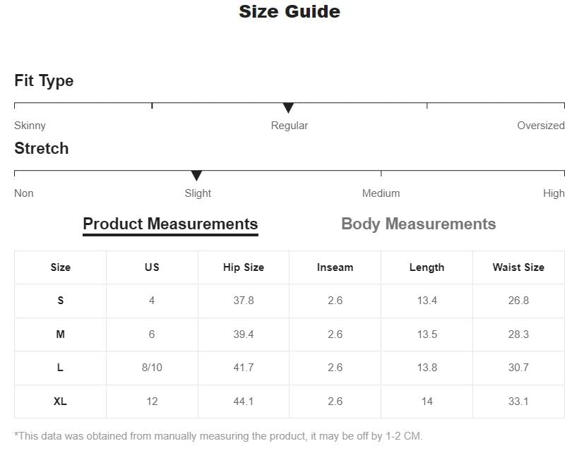 Details: Product Measurements: Small | US: 4.0", Hip Size: 37.8", Inseam: 2.6", Length: 13.4", Waist Size: 26.8" Medium | US: 6.0", Hip Size: 39.4", Inseam: 2.6", Length: 13.5", Waist Size: 28.3" Large | US: 8/10", Hip Size: 41.7", Inseam: 2.6", Length: 13.8", Waist Size: 30.7" X-Large | US: 12.0", Hip Size: 44.1", Inseam: 2.6", Length: 14.0", Waist Size: 33.1"