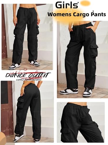 QYANGG Baggy Parachute Pants for Women Drawstring Elastic Low Waist Ruched Cargo Pants Multiple Pockets Jogger Y2K Pants Black