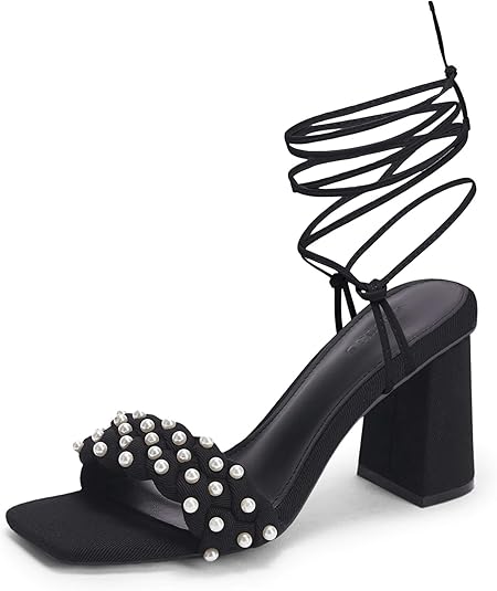 Coutgo Womens Pearl Strappy Heels Sandals Braided Lace Up Chunky Heels Square Open Toe Party Dress Shoes