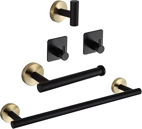 5 Piece Bathroom Hardware Set__‚Black Gold SUS304 Stainless Steel Wall Mounted Bathroom Towel Rack Set Include 16" Lengthen Hand Towel Bar, Towel Hook, Toilet Paper Holder and 2 Adhesive Hooks_Ê_