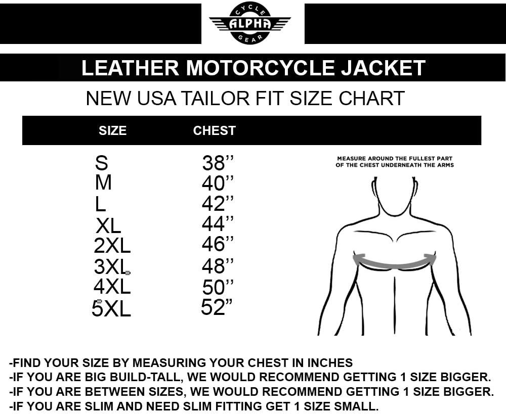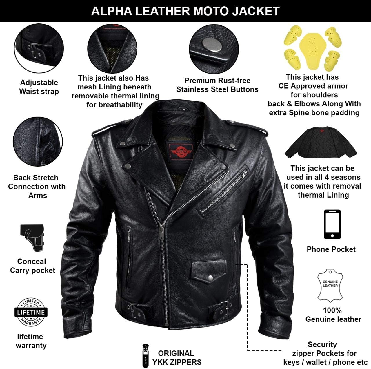 Alpha Black Leather Motorcycle Jacket with Armor for Men Alpha motorcycle riding jackets for men is a CE approved armor motorcycle riding jacket that comes with adjustable waist, zippered cuffs, and lightweight removable armors. This action back power sports protective gear is made of 100% genuine leather and comes with a conceal carry pocket. This motorcycle riding gear also has premium rust-free stainless steel buttons and original YKK zippers. This armored motorcycle jacket is perfect for the professional rider. Riders jacket features a phone pocket, outer pockets, and a removal thermal lining to make it a cruiser jacket. The mesh lining inside motorcycle riding leather jacket allows for breathability, and the foam padding on the lower back provides extra protection. The mesh motorcycle jackets for men is made of no-wrinkle leather and is triple stitched for durability. Our promise: Any issues with the Alpha armored jacket men, message us we have for your purchase covered. We are certain you would not find premium quality leather rider jacket men anywhere else on the motorcycle protective gear market. We take less profit to make it affordable for our fellow bikers for safe motorcycle riding. Search Alpha cycle gear and find more affordable deals on genuine leather motorcycle jacket, motorcycle vest, motorcycle armor pant and more.