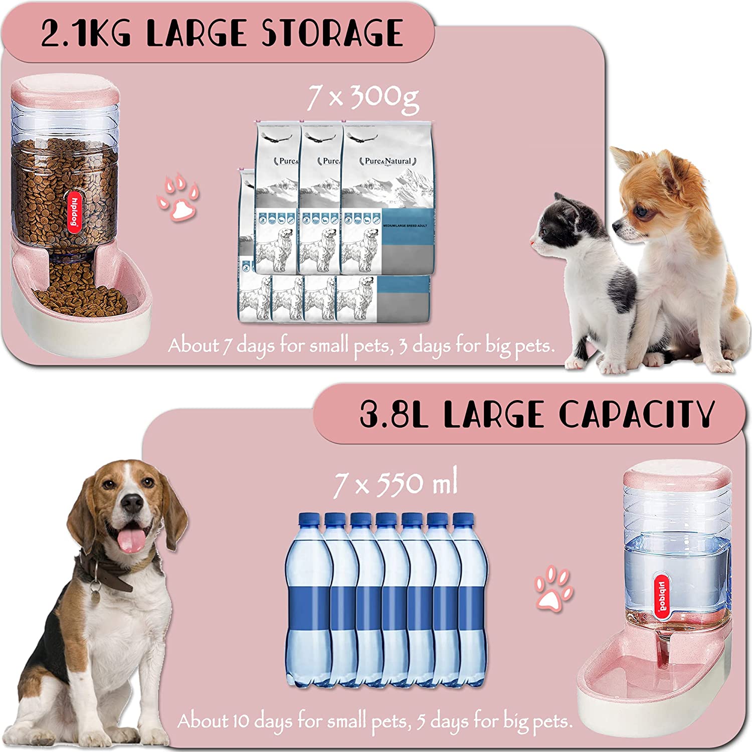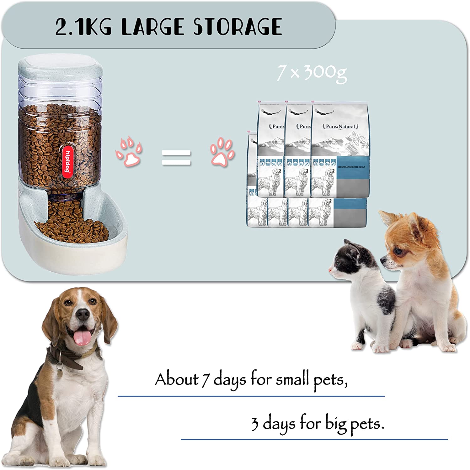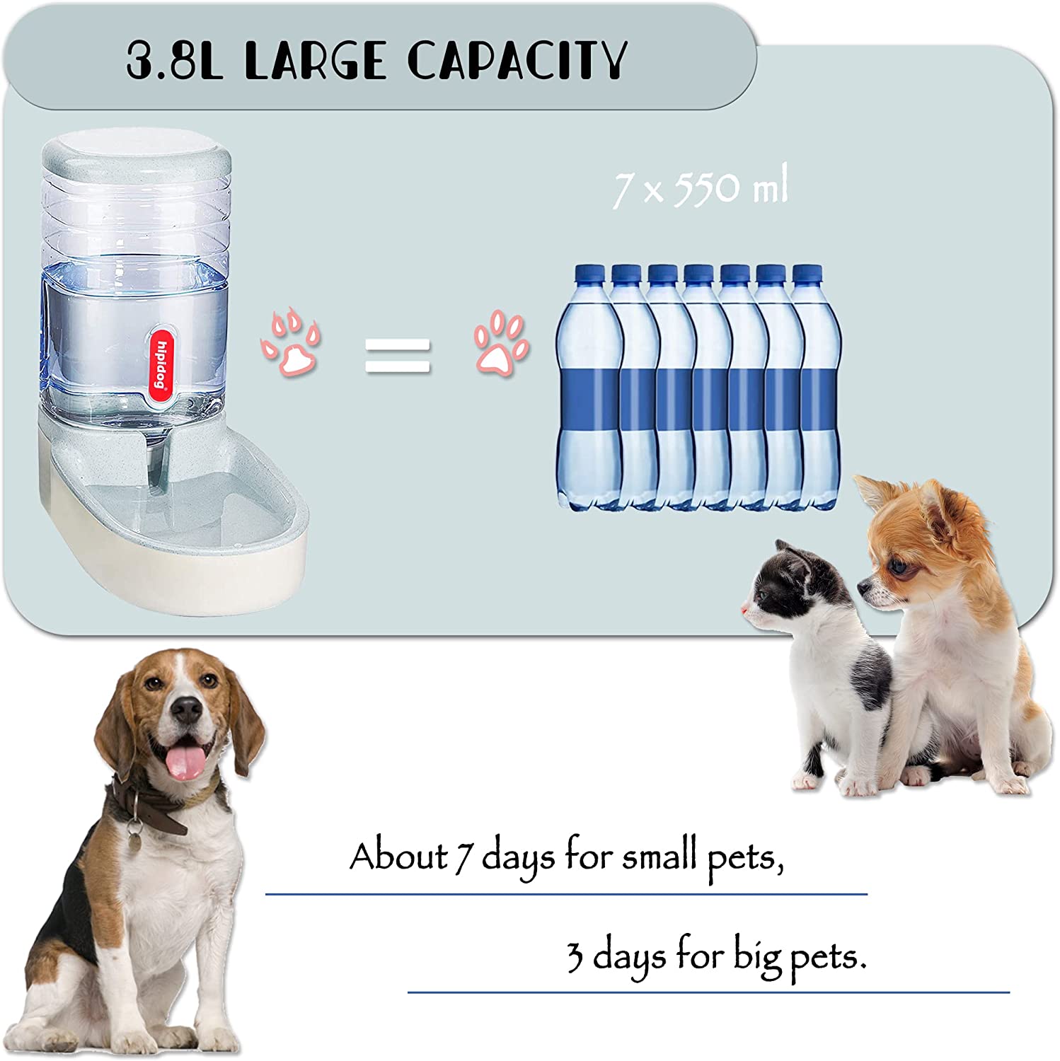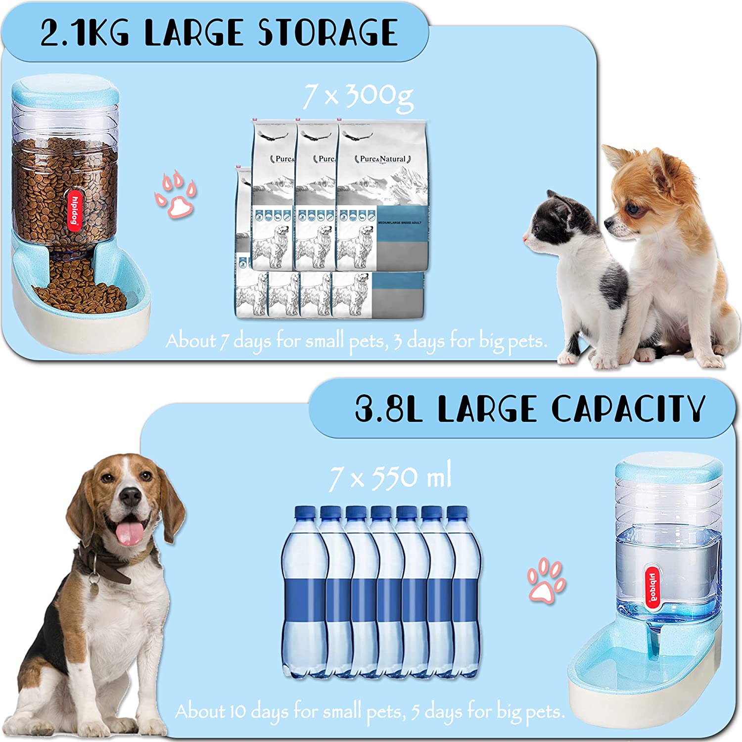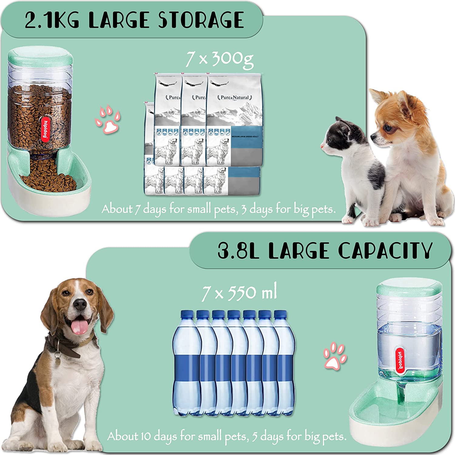 • 2.Size and Capacity: both feeder and waterer measures 32x21x32cm;large capacity 3.8L, can last about 7days for small pets,3 days for big pets, you can rest assured to go on vacation, work, party, do not have to worry about pets will be hungry.