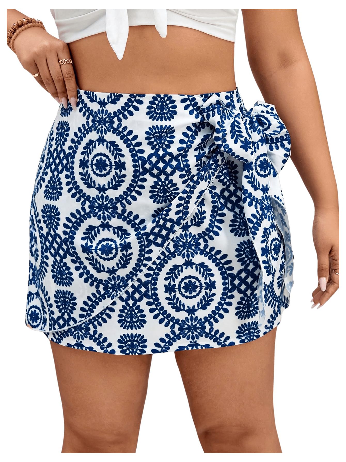 • Feature: Plus, Allover Print, Knot Side, Wrap, High Waisted, Mini Length, Boho Short Skirt for Women