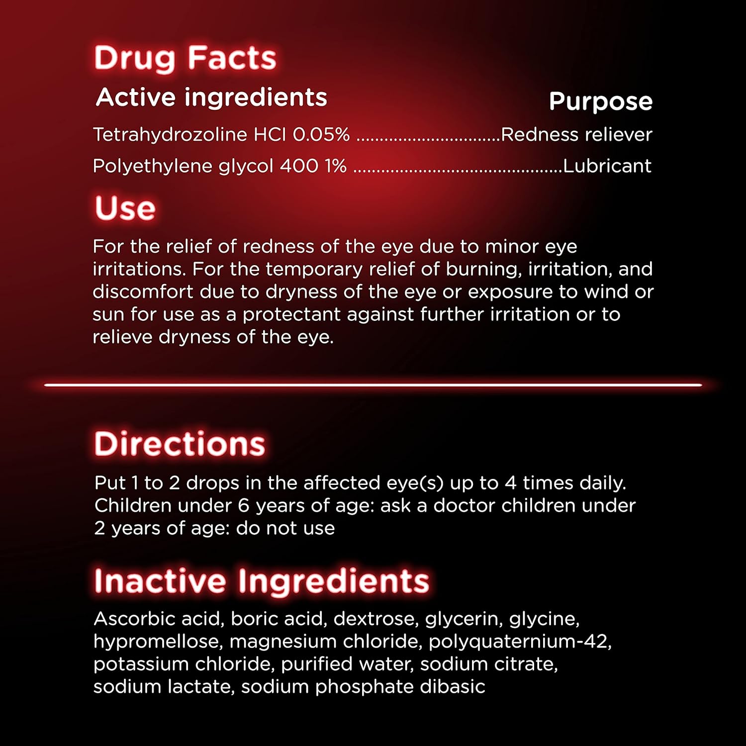• Relieve redness due to minor eye irritations like exposure to smoke, lack of sleep and extended screen time with a formula containing 0.05% tetrahydrozoline hydrochloride
