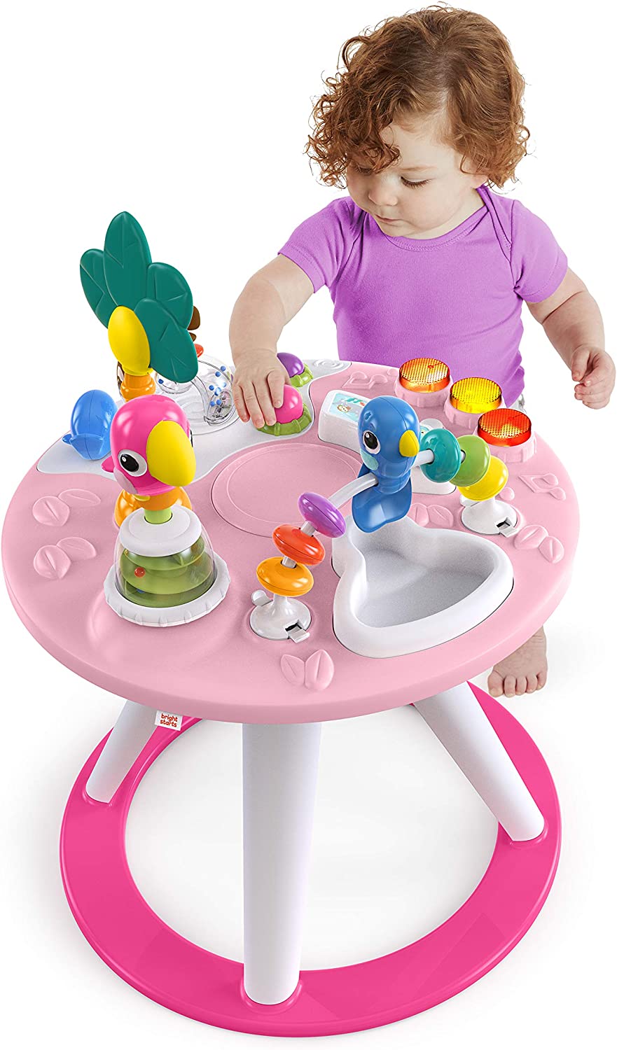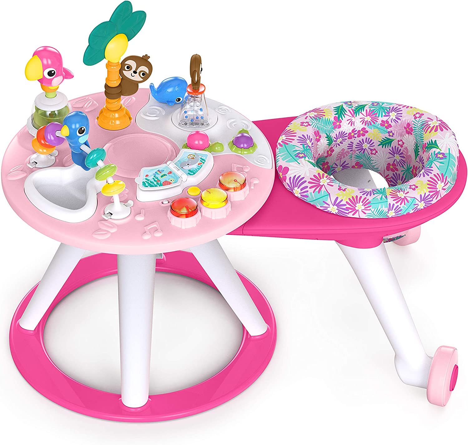 The Around We Go 2-in-1 Walk-Around Activity Center Table from Bright Starts is made for multiple modes, multiple milestones, multiple kids at once. Keep playtime in one place with an activity center that features a walk-around seat for easy access to all the toys. Your family will get years of use with this multifunctional, grow with me activity center. Remove the walk-around seat as baby learns to stand, and you'll transform the activity station into a toddler table. Siblings can get in on the fun, too, because multiple kids can play at once. This Tropic Cool fashion is packed with island-inspired entertainment that help baby practice gross motor skills. The interactive drum set features 2 modes of use. Flip between tiki tunes and animals sounds to keep playtime totally tropical. Includes 10 activities: Musical and light-up drum set, spinning animals, ratcheting toy, bead chaser, surfing monkey and more.