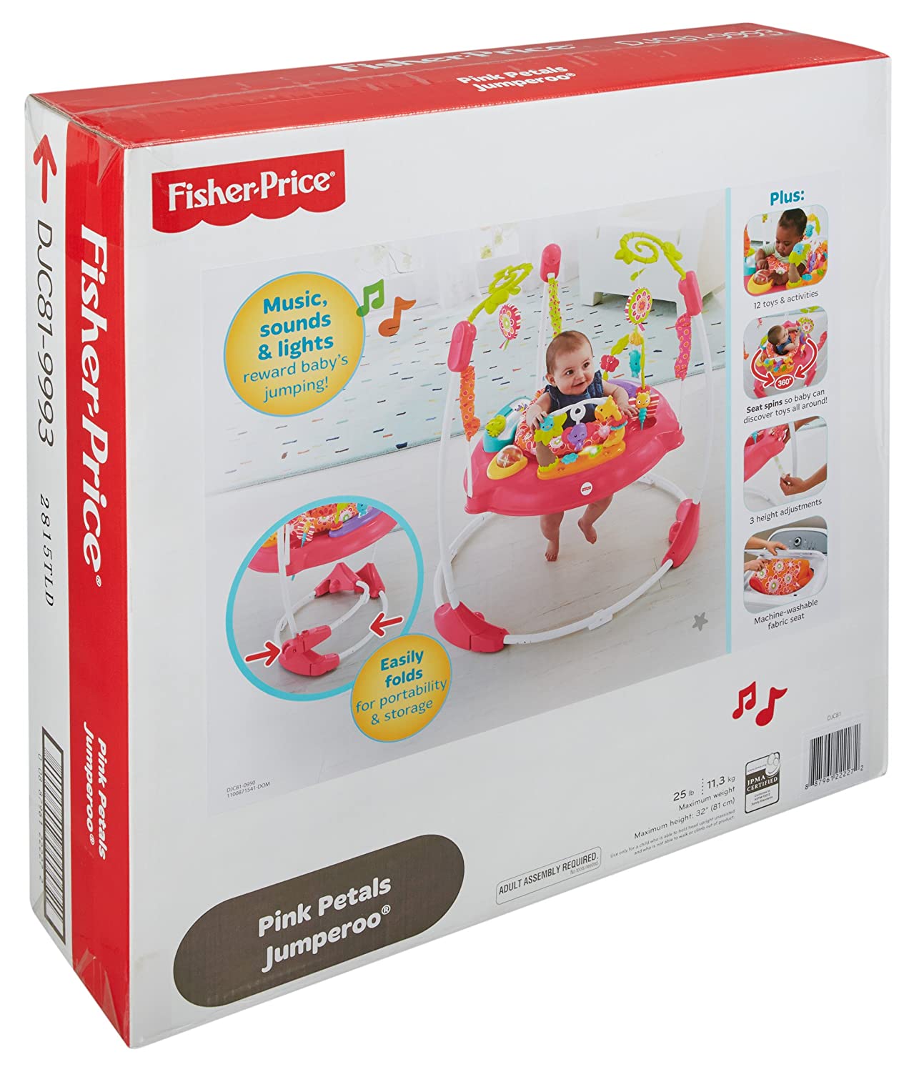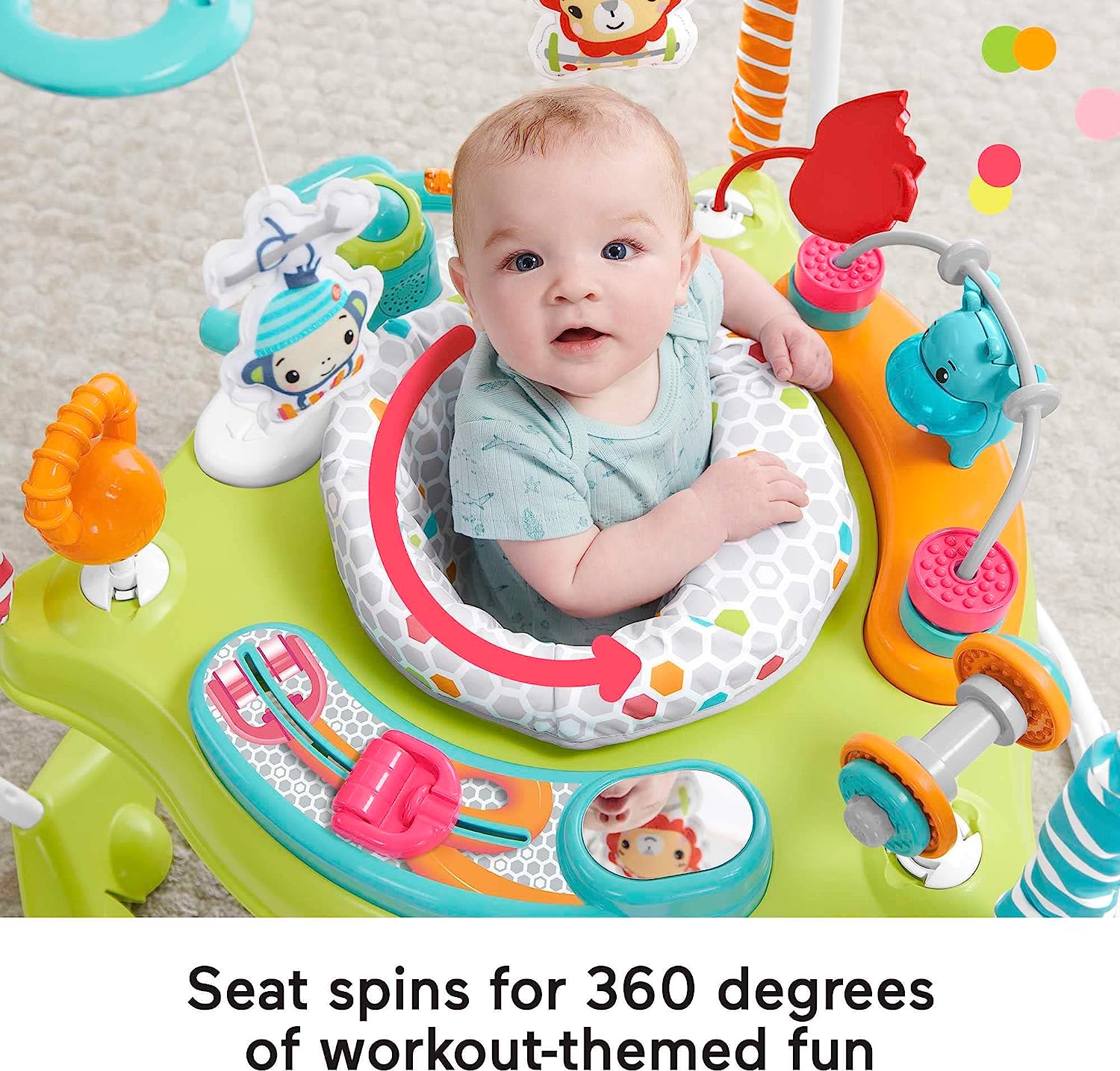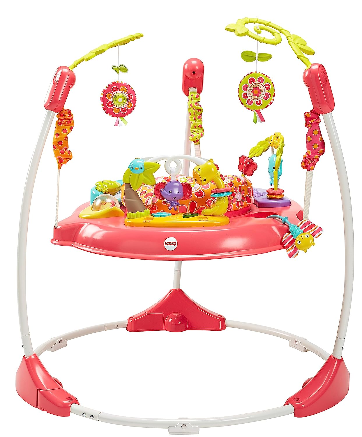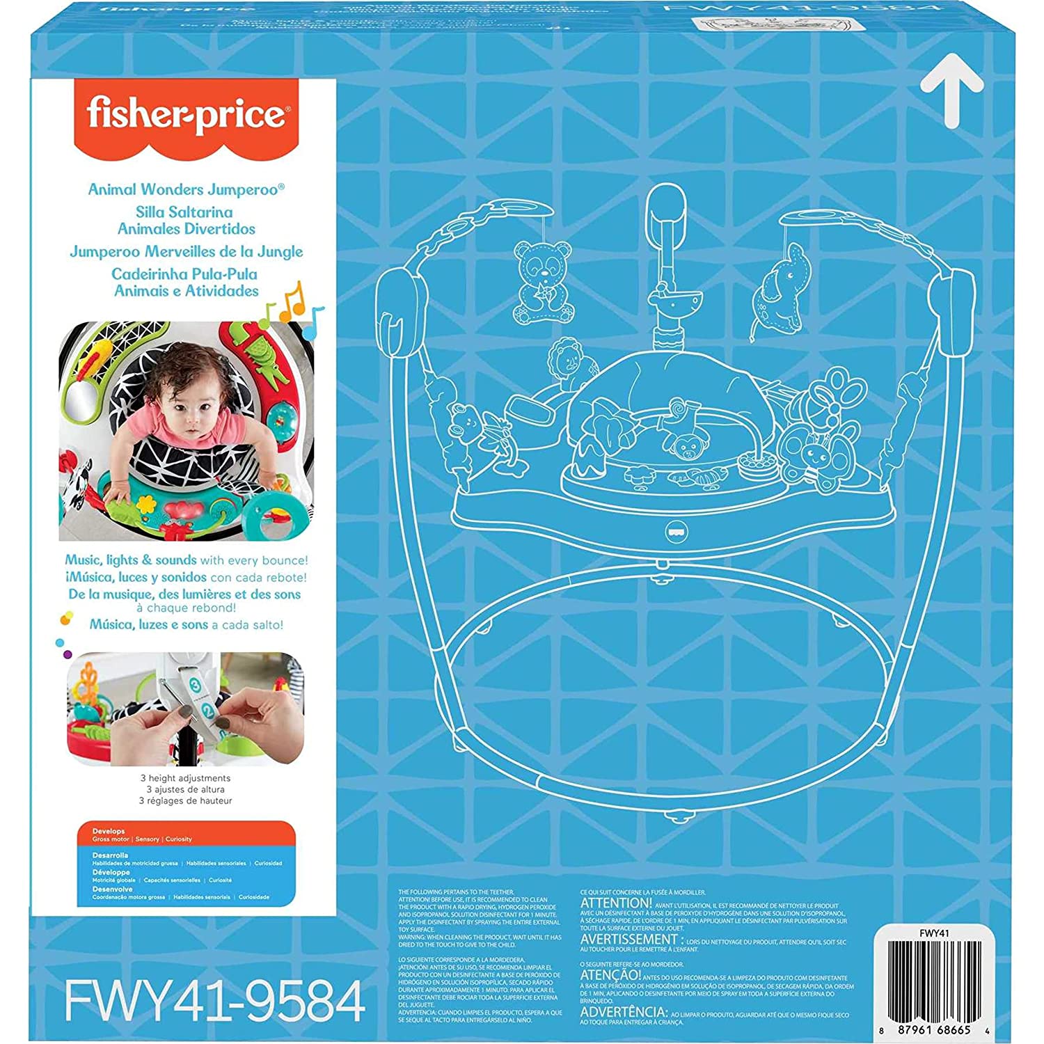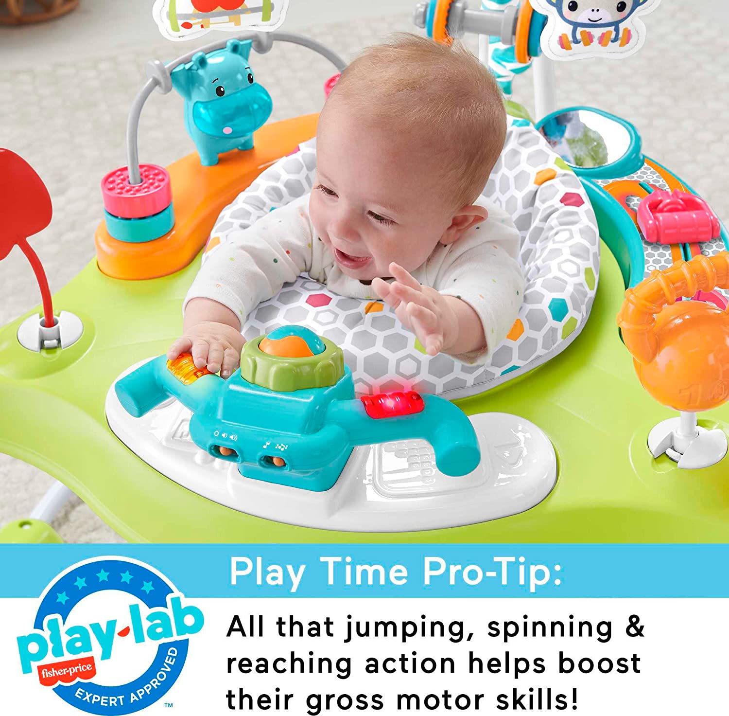 Your baby will love exploring all the hands-on fun of this Fisher-Price Animal Wonders Jumperoo activity center. The rotating seat gives little ones 360-degree access to toys, activities, and animal pals, including a roller ball, bead bar, teether, mirror, and so much more. As your tiny explorer discovers all the fun, their every jump is rewarded with playful music, lights, and sounds. Max. weight 25 lb/ 11,3 kg. Use only with a child who can hold their head up unassisted and who is not able to walk or climb out of the product.