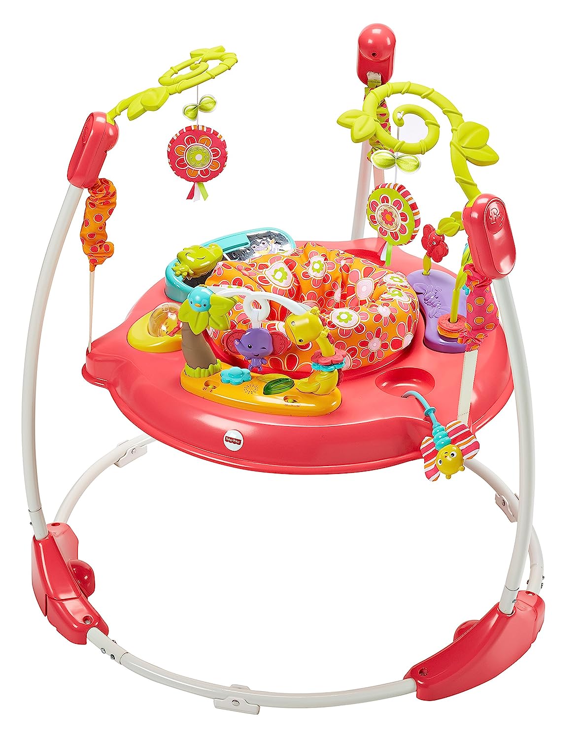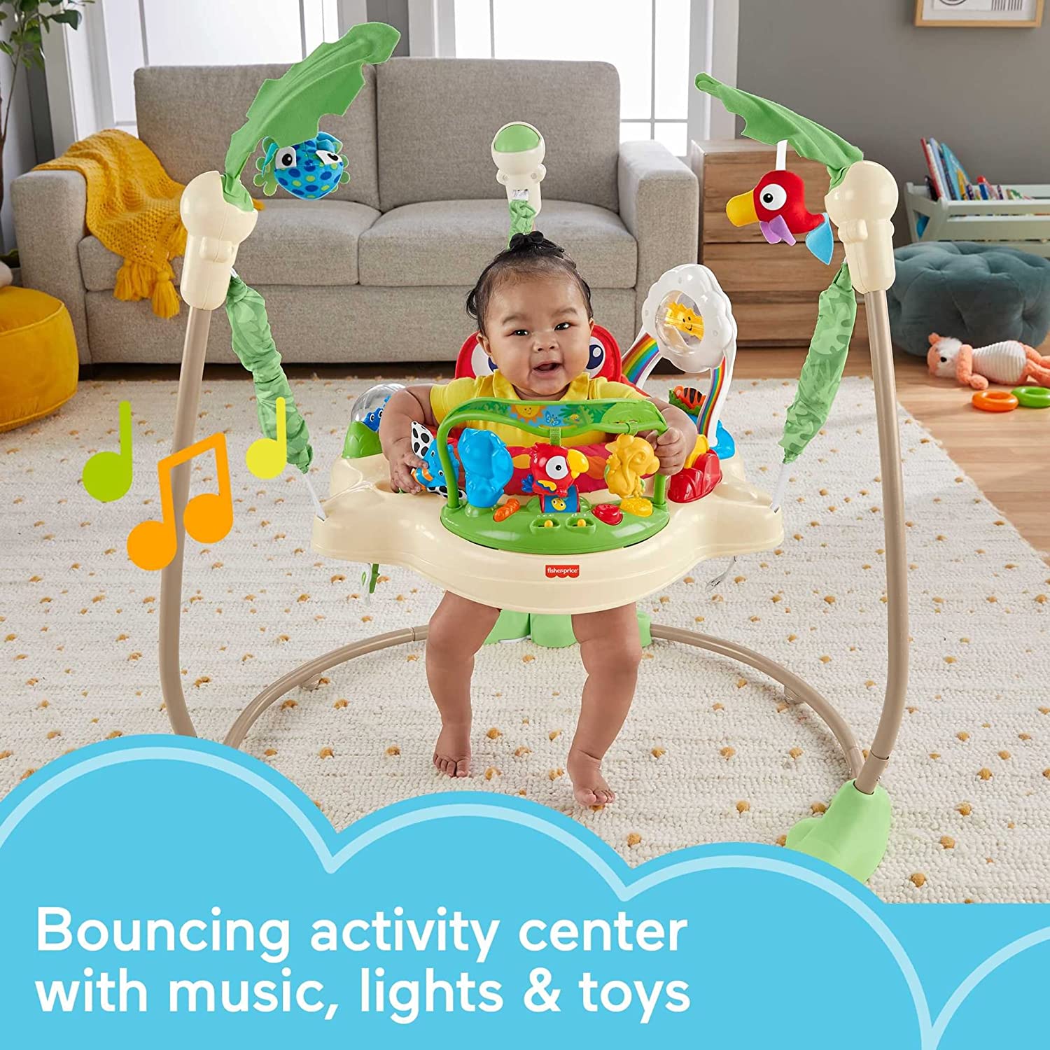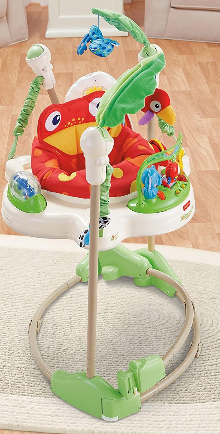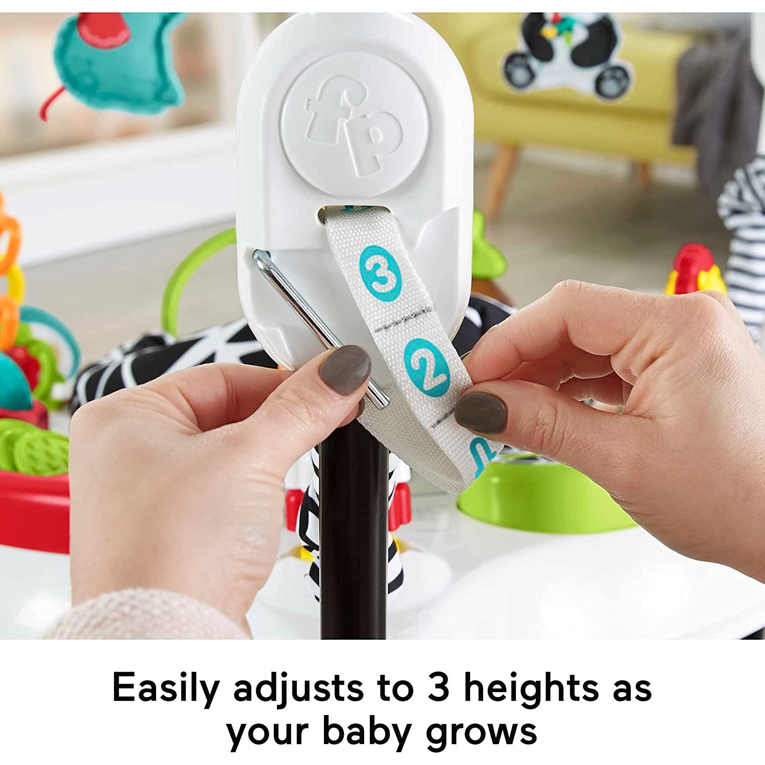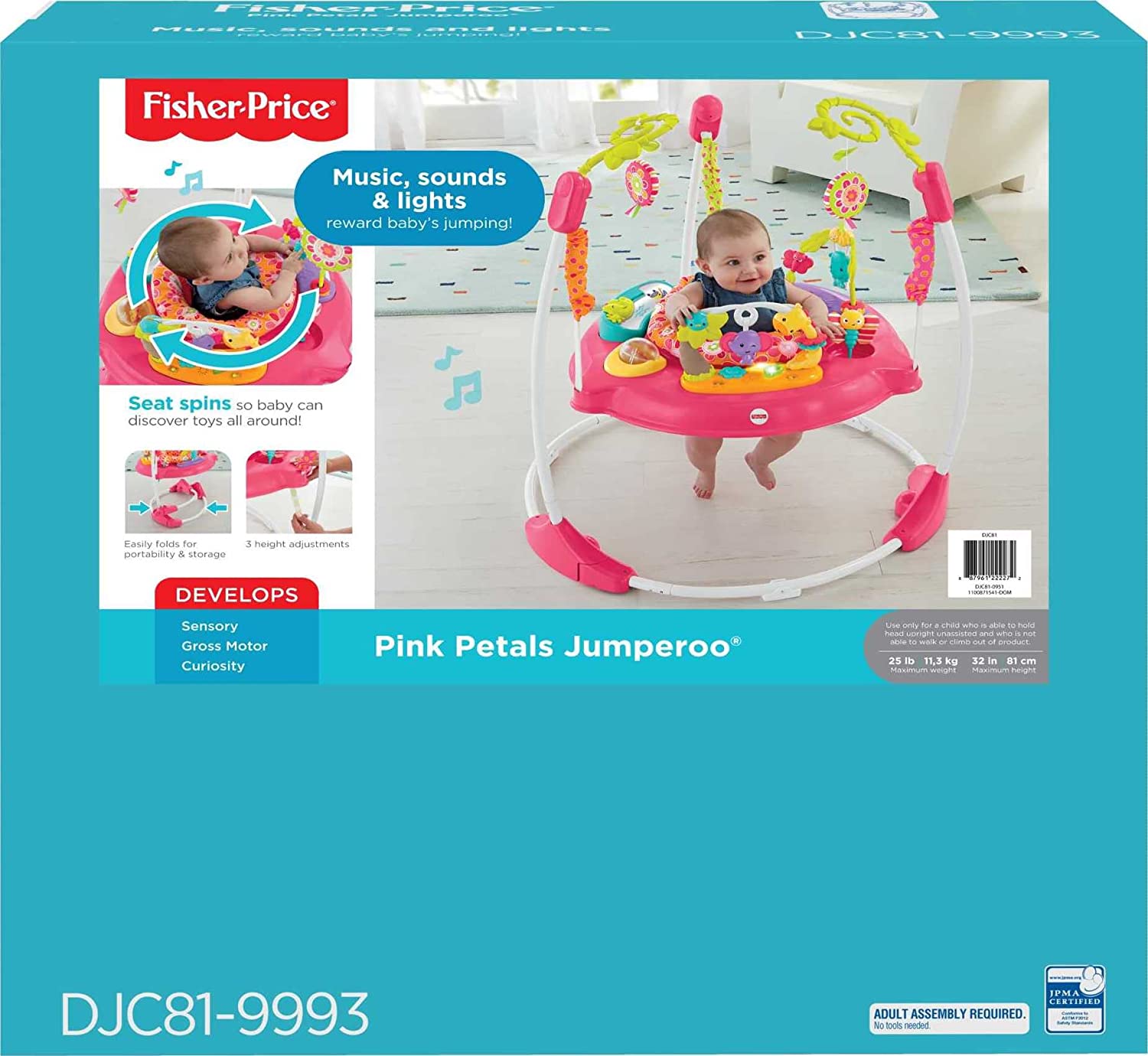 Your baby will love exploring all the hands-on fun of this Fisher-Price Animal Wonders Jumperoo activity center. The rotating seat gives little ones 360-degree access to toys, activities, and animal pals, including a roller ball, bead bar, teether, mirror, and so much more. As your tiny explorer discovers all the fun, their every jump is rewarded with playful music, lights, and sounds. Max. weight 25 lb/ 11,3 kg. Use only with a child who can hold their head up unassisted and who is not able to walk or climb out of the product.