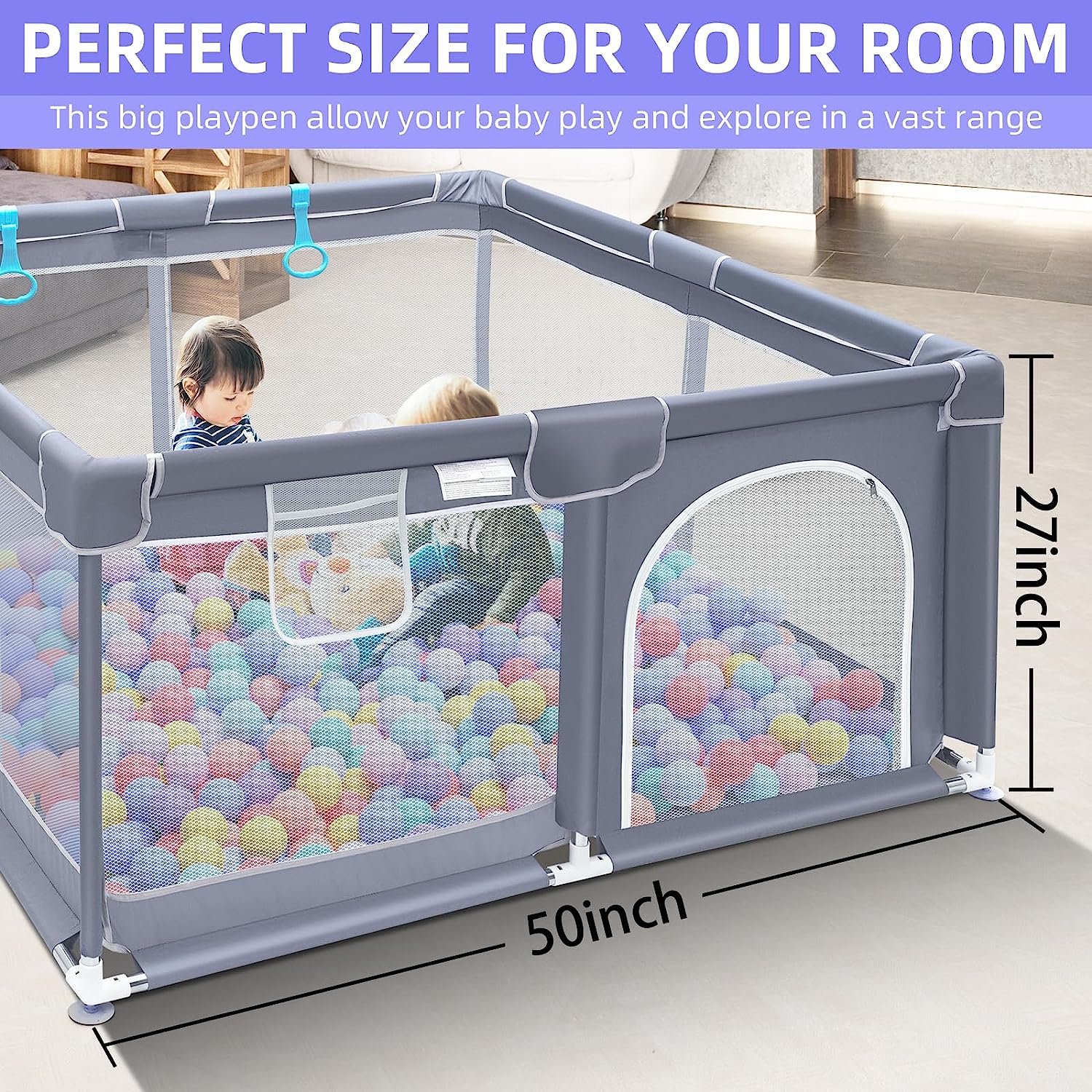 Suposeu Baby Playpen for Toddler, Large Playard, Play Pens for Babies and Toddlers, Indoor & Outdoor Kids Activity Center, Sturdy Safety Play Yard with Soft Breathable Mesh(Gray,50”×50”)