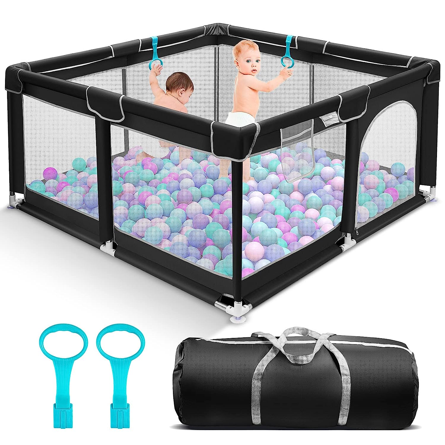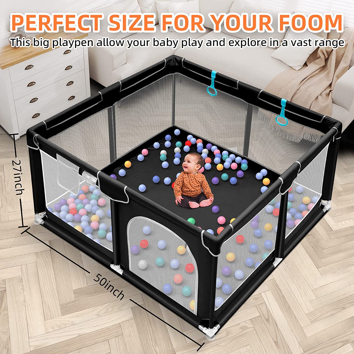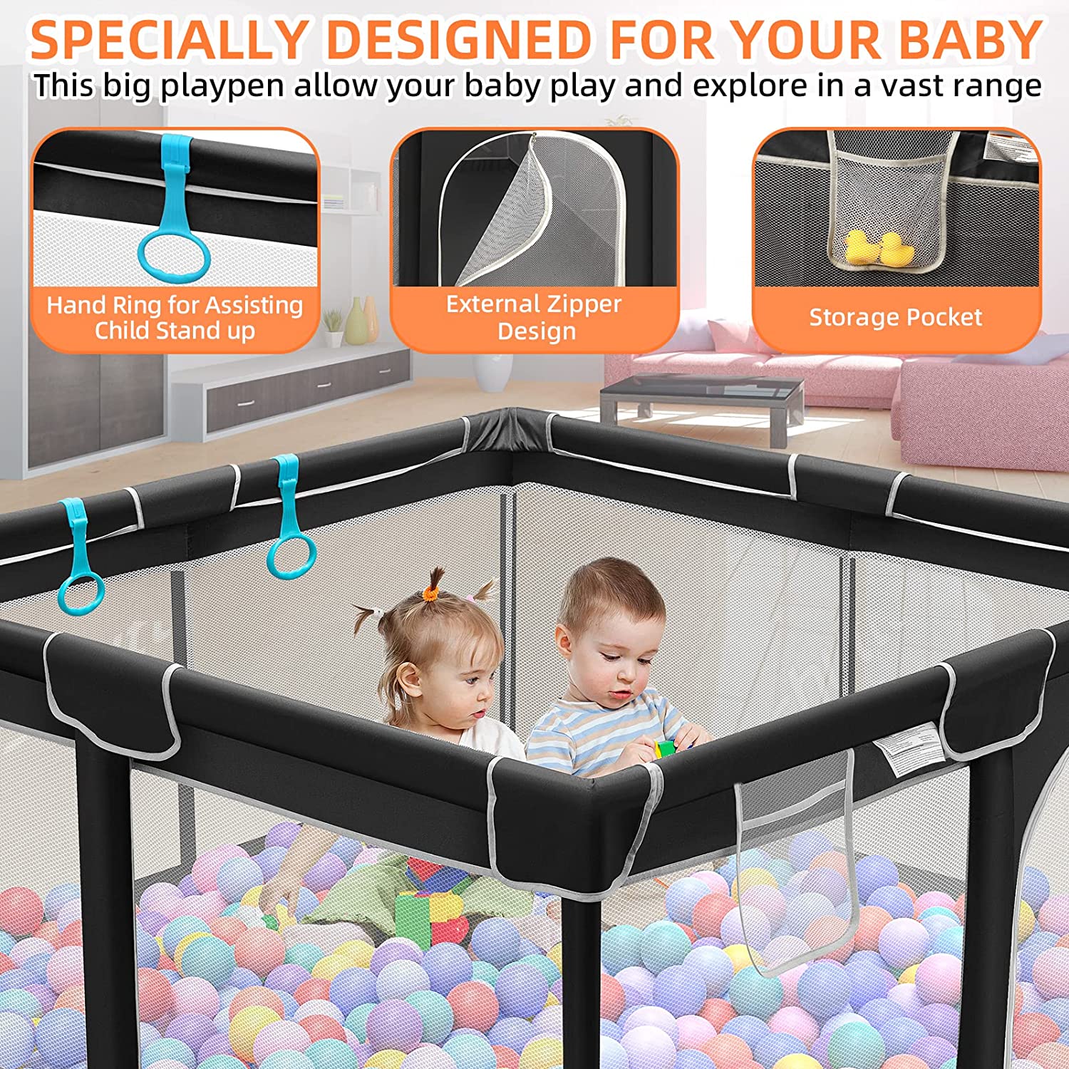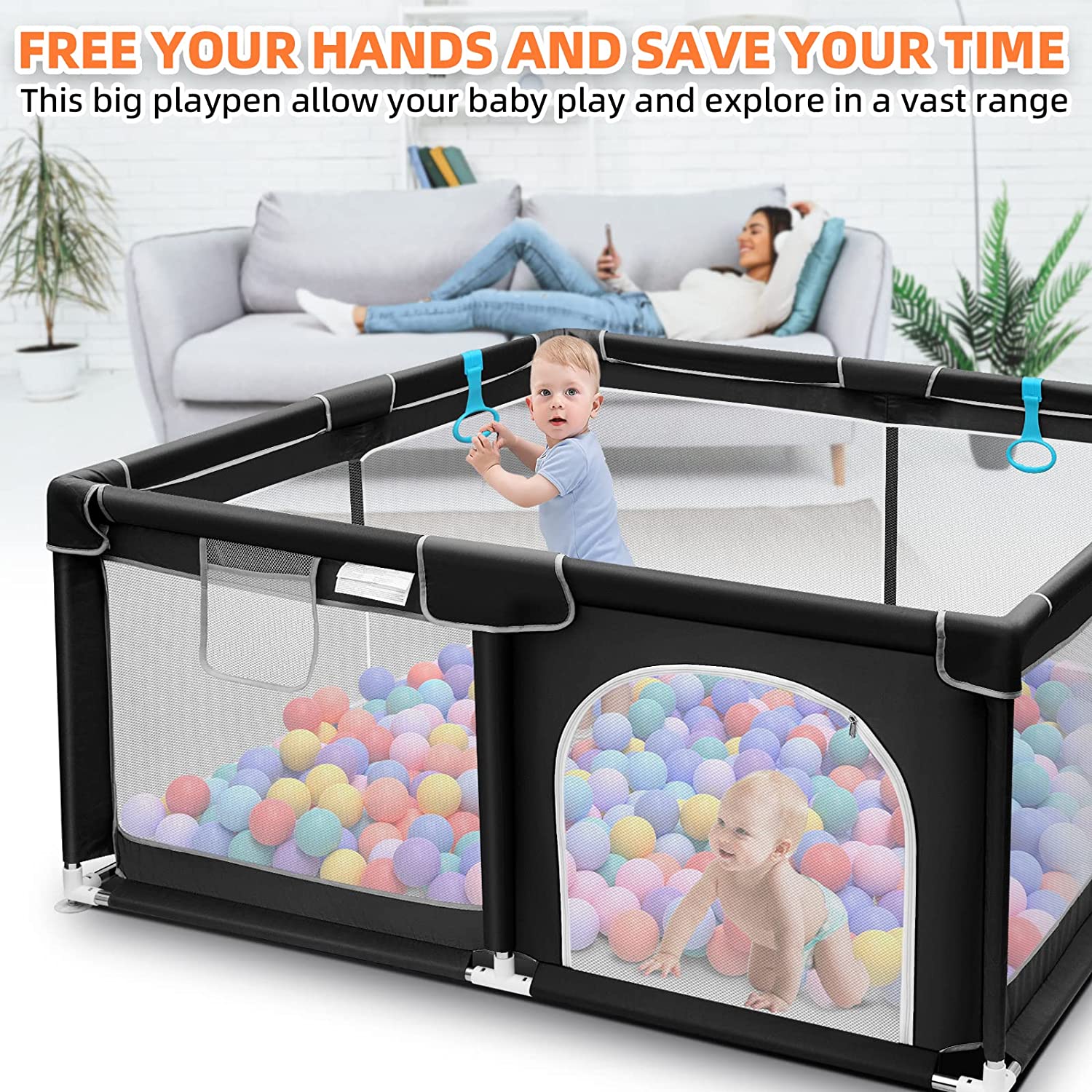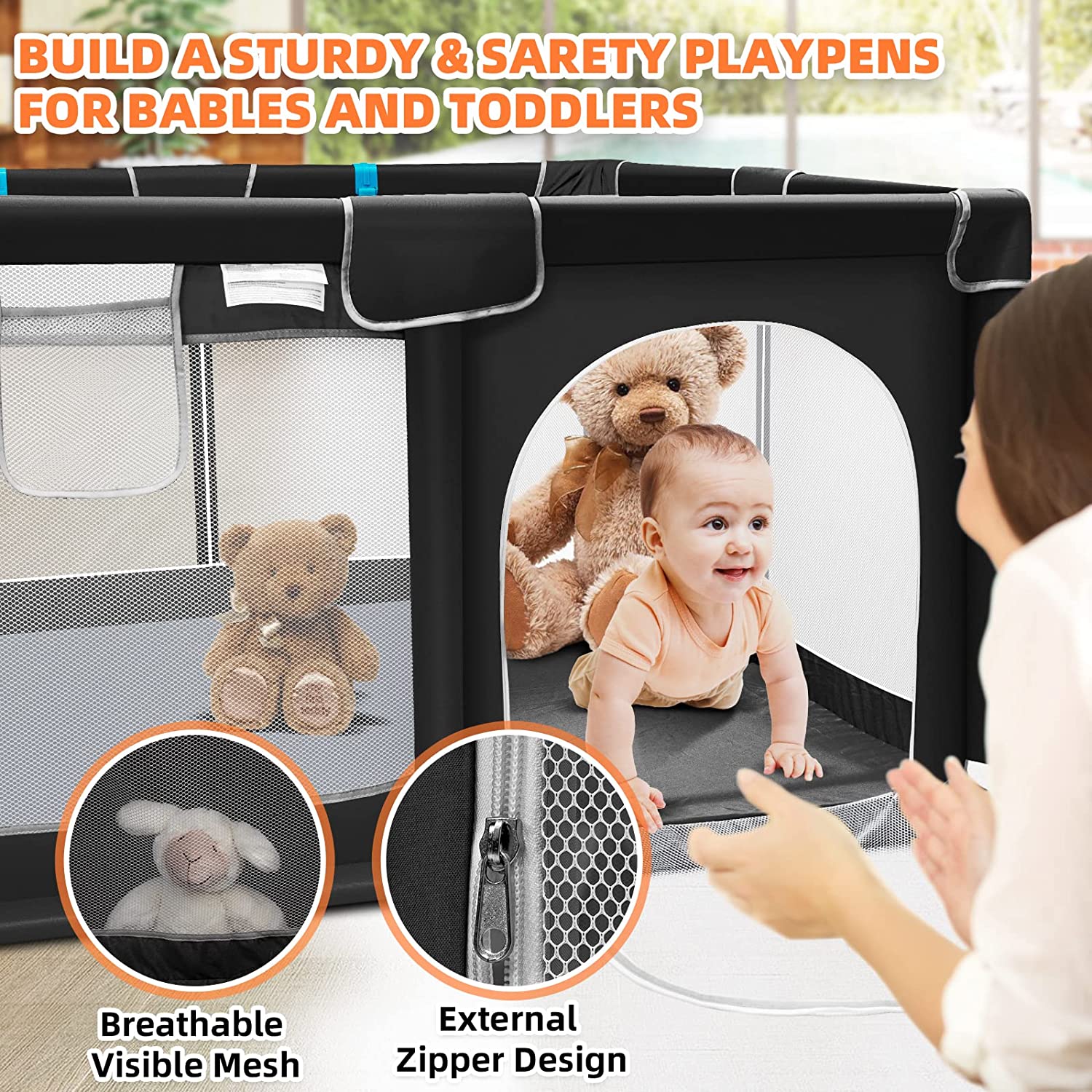 • 360° Full Vision Design: The four side walls of the playpen are made of visible and breathable mesh. Children can see their mothers outside the fence from multiple sides no matter sitting or lying down, which will make them feel safe.
