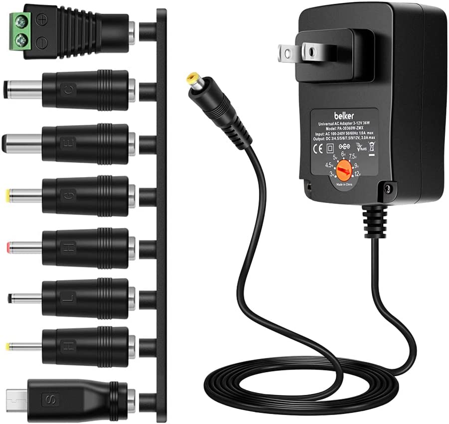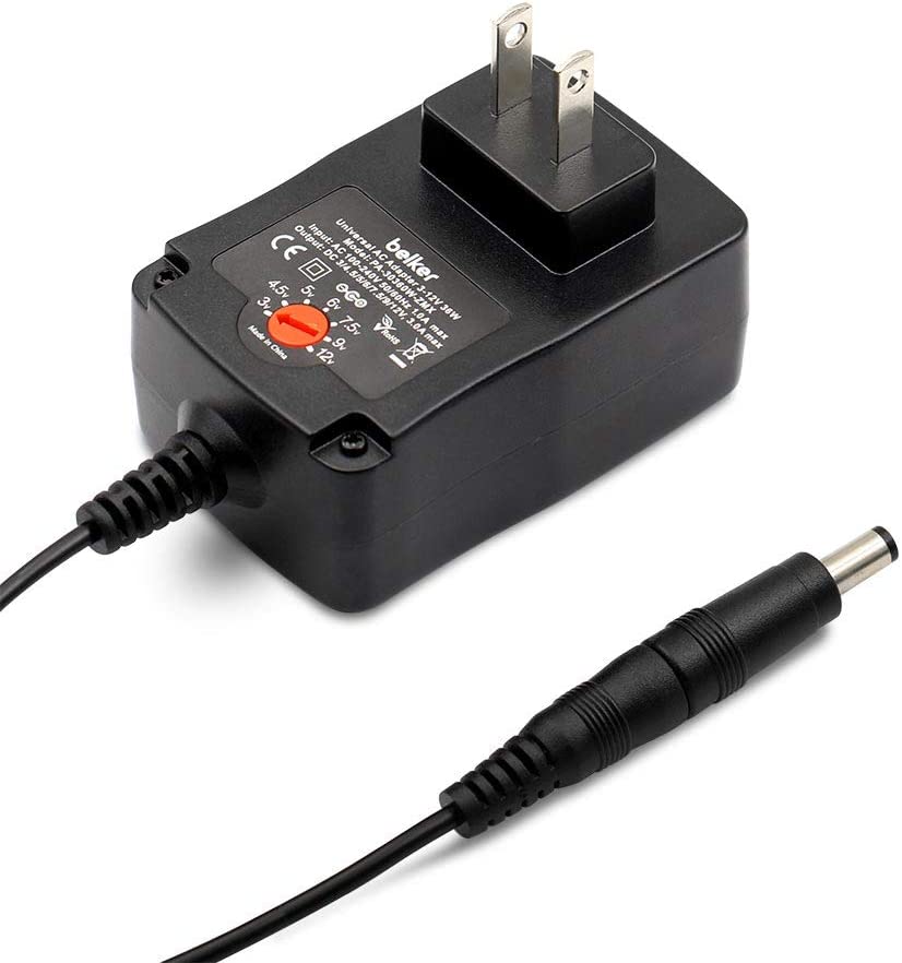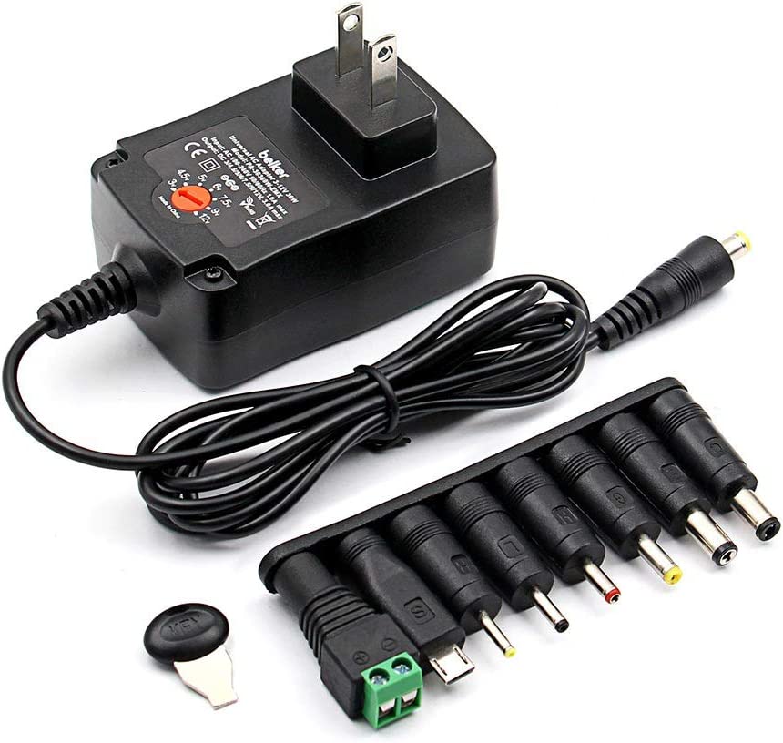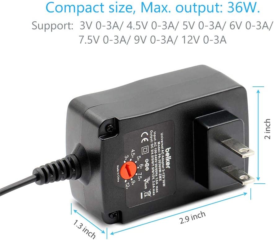 Belker 36W Universal 3V 4.5V 5V 6V 7.5V 9V 12V AC DC Adapter Power Supply for LCD LED Light Strip Router HUB Speaker Smart Phone TV Box 1A 1.5A 2A 2.5A 3A 3000mA Amp Max.