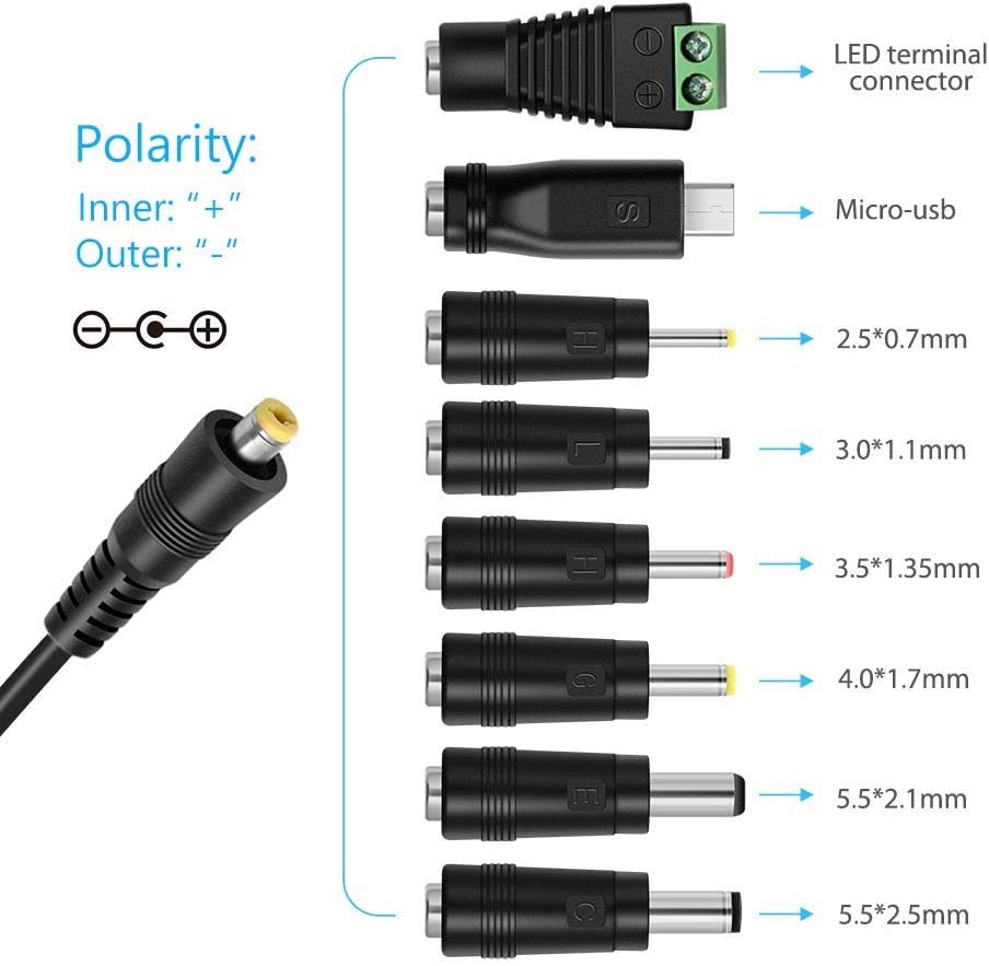 • This replacement power adapter offers 8 interchangeable tips, which makes it fits 95% of AC/DC home appliances, Such as 3V to 12V Household Electronics, Tablet, Scales, Routers, Speakers, LED Strip Lights, CCTV camera system, USB Charging Camera, USB powered devices and more.