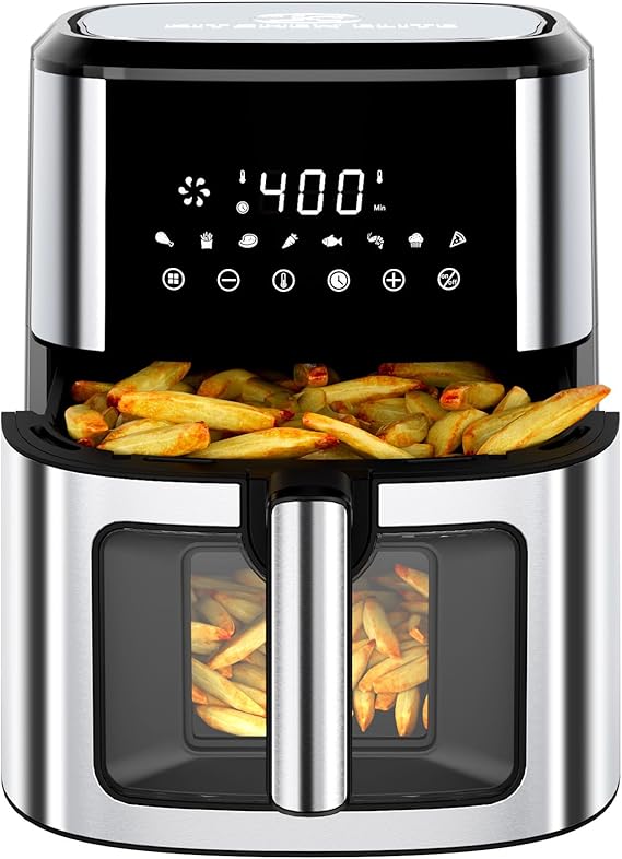 Air Fryer Stainless Steel with View Window, XL 8.5QT Large Airfryer, 8-in-1 Digital Control, 400ԍF Temp Controls, Nonstick Dishwasher-Safe, Space-Saving, Roast, Broil, 1500W