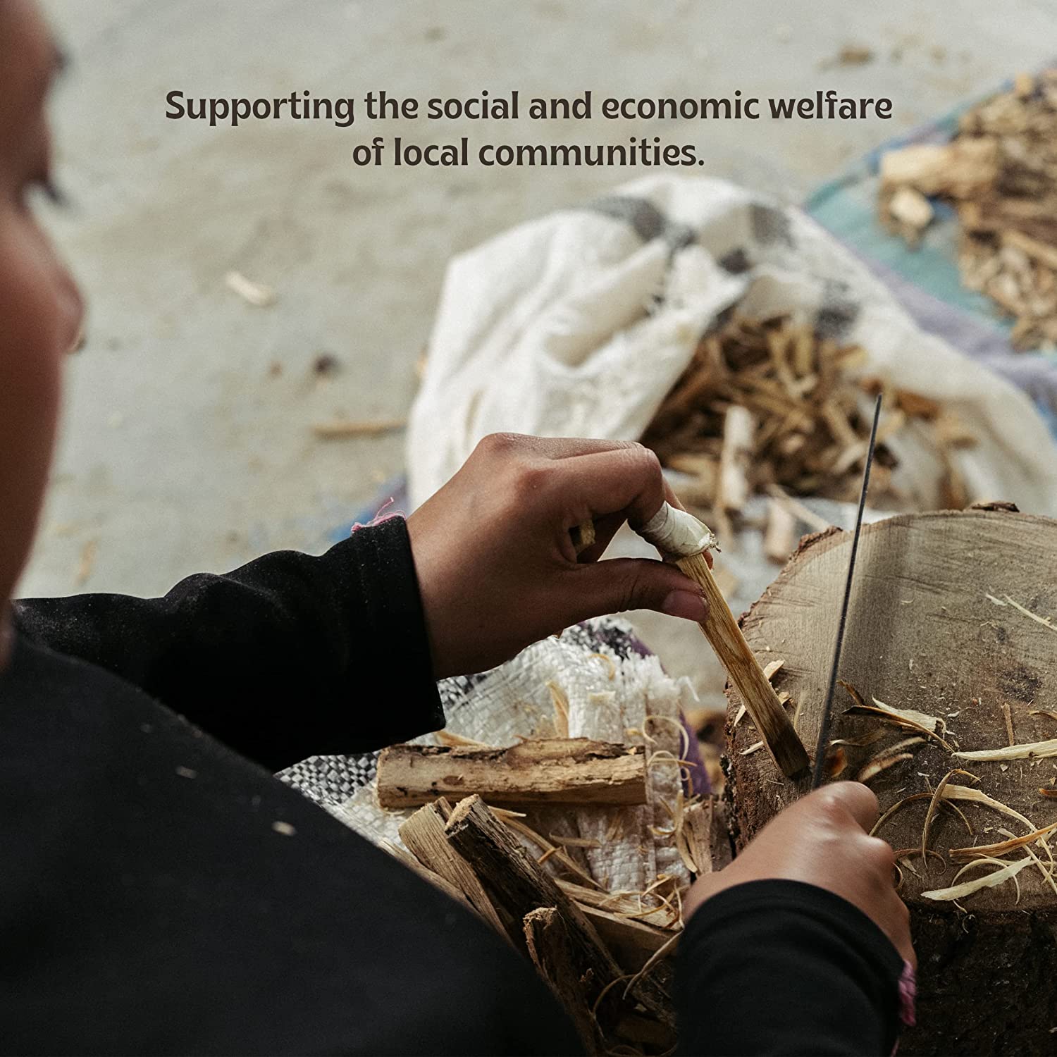 • We work directly with agriculturists and farmers in northern Peru to guarantee fair-trade practices. Local communities benefit directly from collecting and selling Palo Santo.