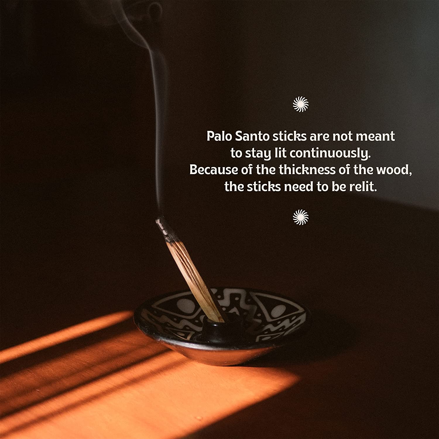 • Use a lighter to ignite your Palo Santo stick at a 45 degree angle, allowing it to burn for about a minute. Blow out and waft around your home or workplace, or anywhere else you desire clear energy.