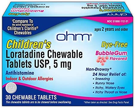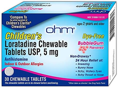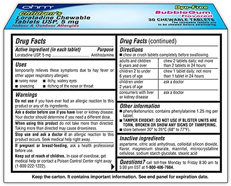 · Compare to the active ingredient of Children’s Chewables · 24 hour relief of sneezing, runny nose, itchy, watery eyes, and itchy throat or nose · Dye Free · Antihistamine · Non-drowsy · Indoor and outdoor allergies · Bubblegum flavored · Ages 2 years and older · 30 chewable tablets