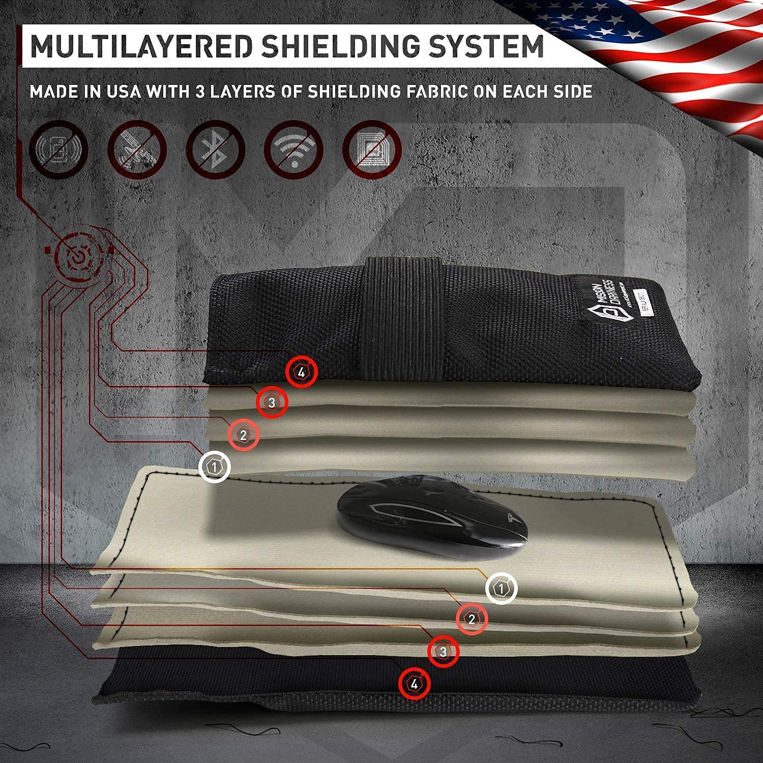 • ✅ QUALITY CONSTRUCTION - Three layers of high-shielding TitanRF Faraday Fabric on all sides with dual paired seam construction ensures signal loss. The exterior is constructed with durable and water-resistant ballistic nylon. Secure closable flap with elastic for easy access, belt loop, and unique serial number on every bag.