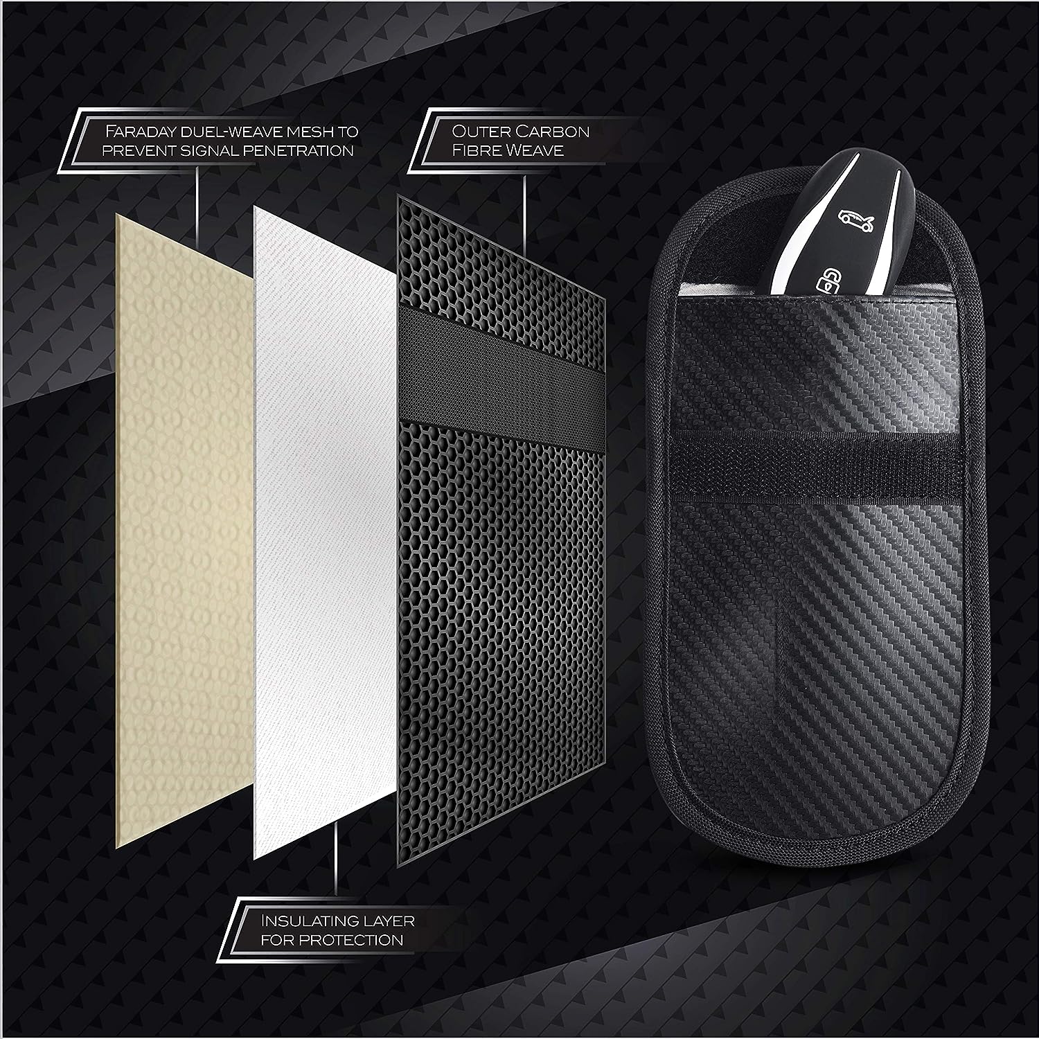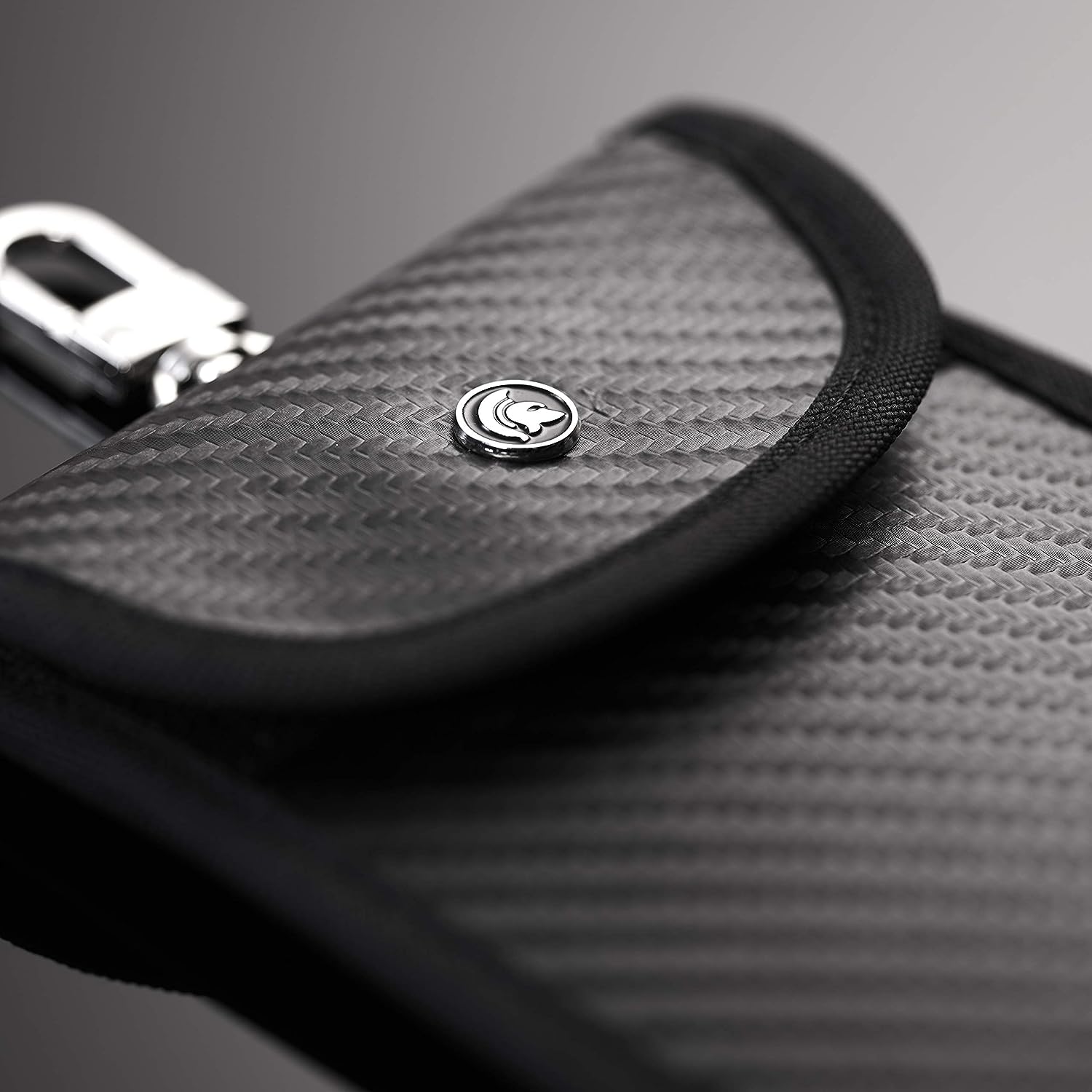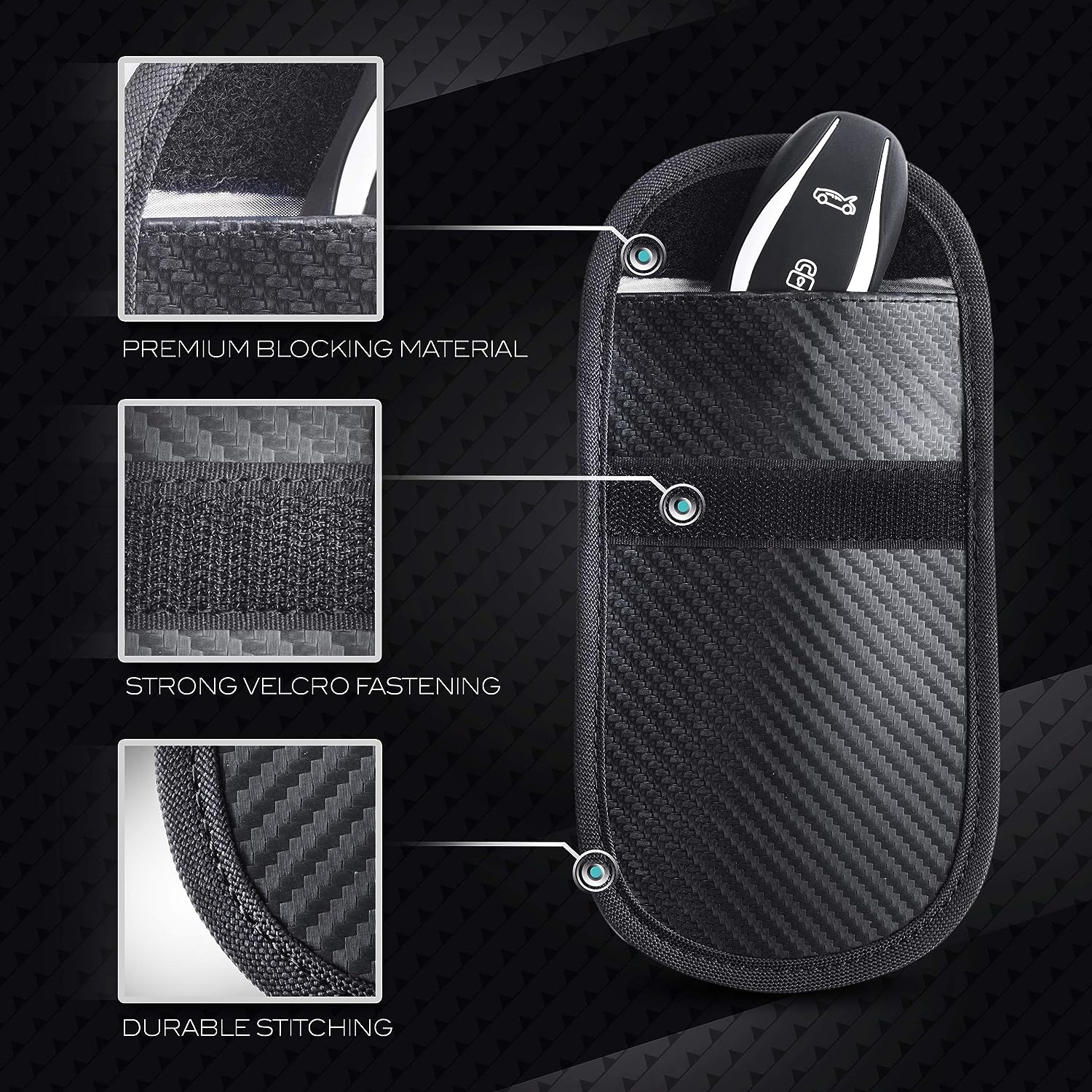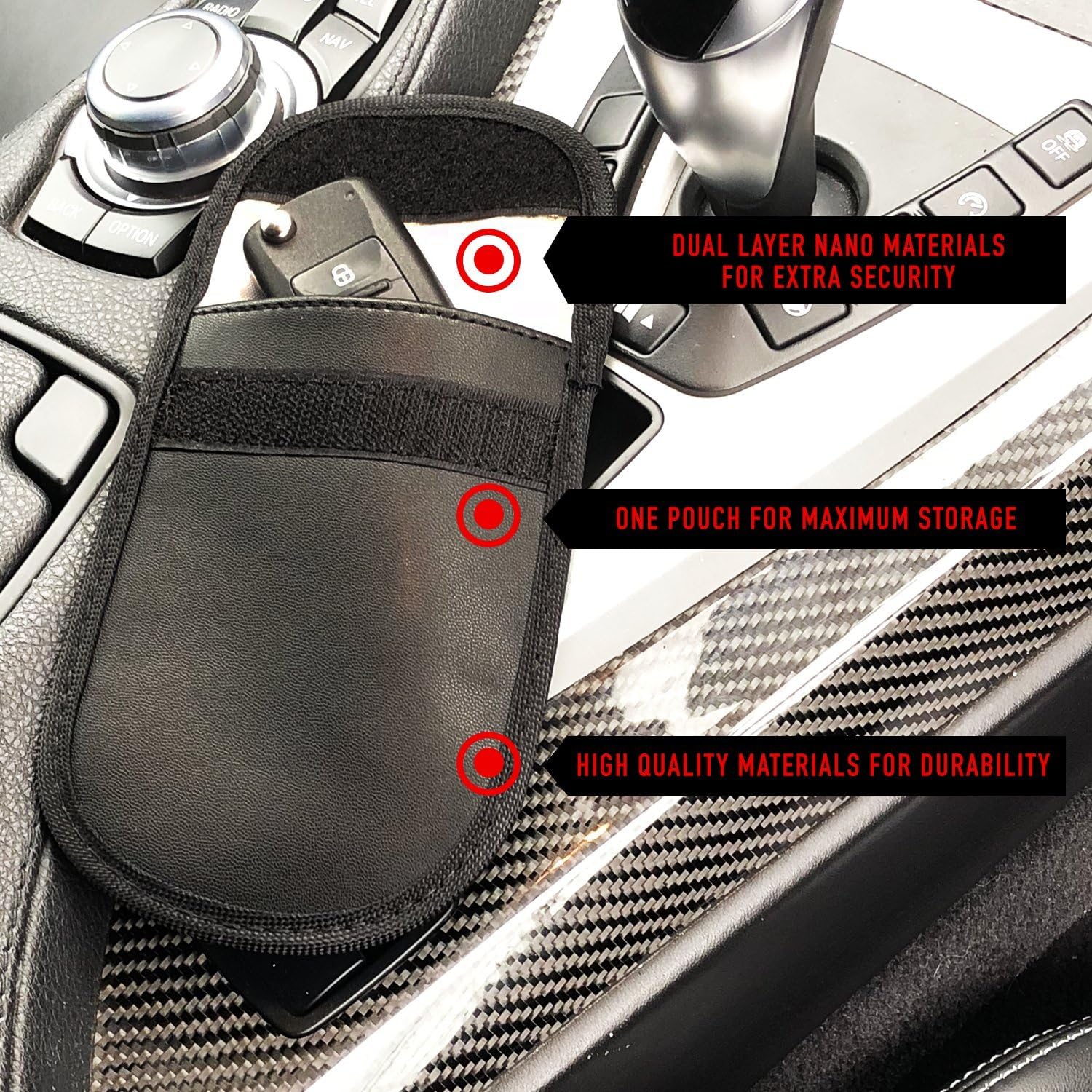 • FITS ALL KEY FOBS. Our faraday pouch key protector fits 99% of key fobs. Wrapped in multi-layered RFID shielding within polymer housing, with wear-resistant, double stitched outer layer. Car key pouch RFID blocker doesn’t need to sacrifice style