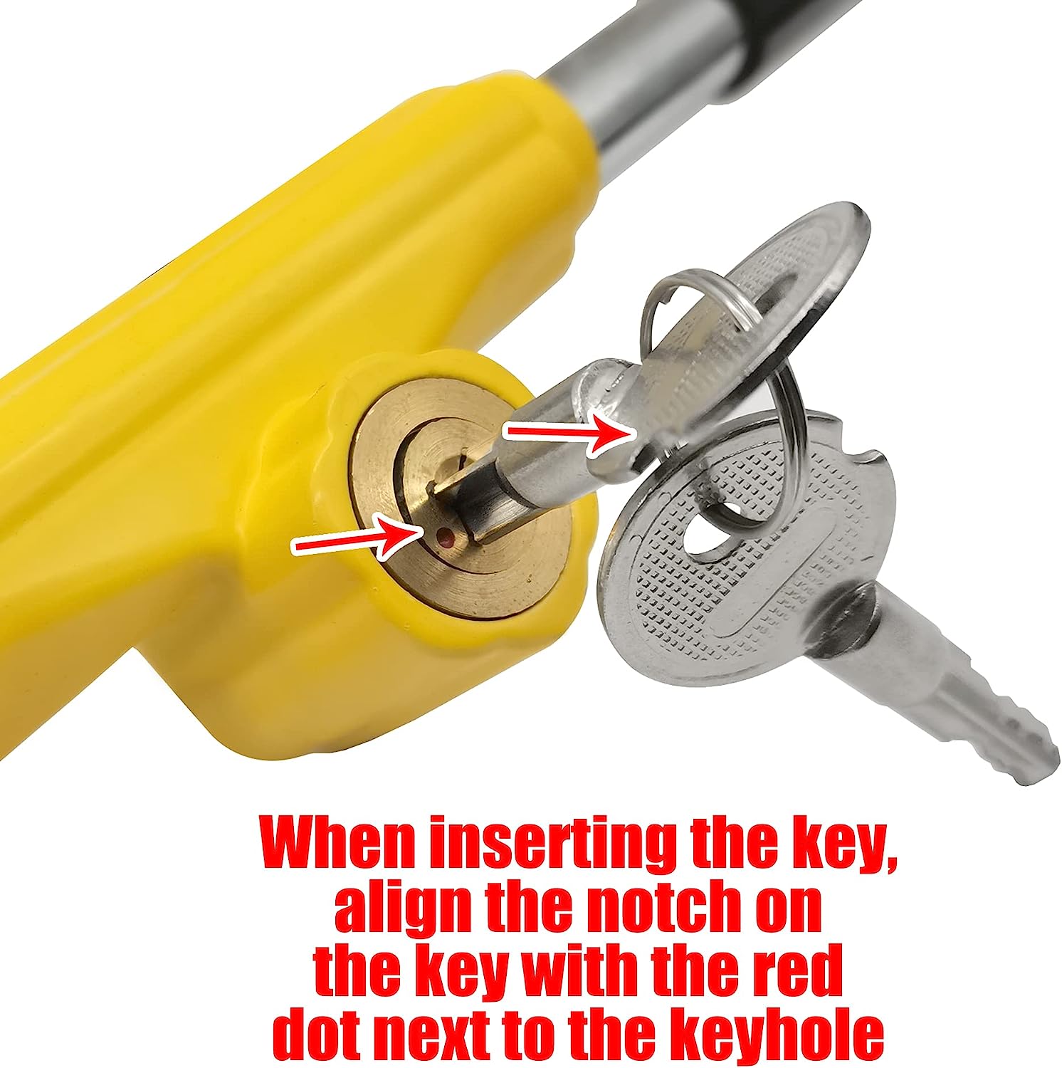 • [2x Security Keys] This car theft prevention device with a unique cross-key design is almost impossible to duplicate. Easy to use, install in seconds,disables steering,can effectively prevent the theft.Note: The notch of the key needs to be aligned with the red dot next to the key hole, and then the key is inserted.