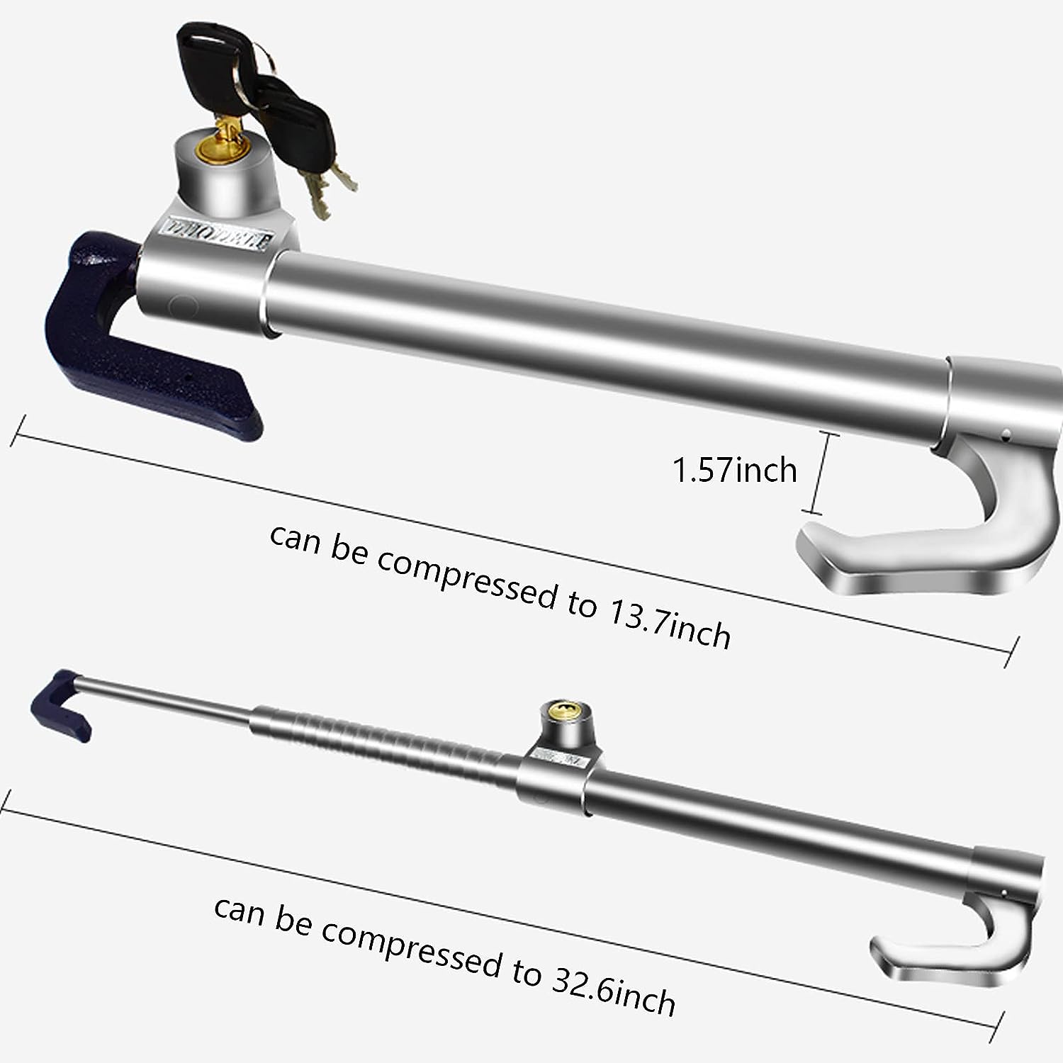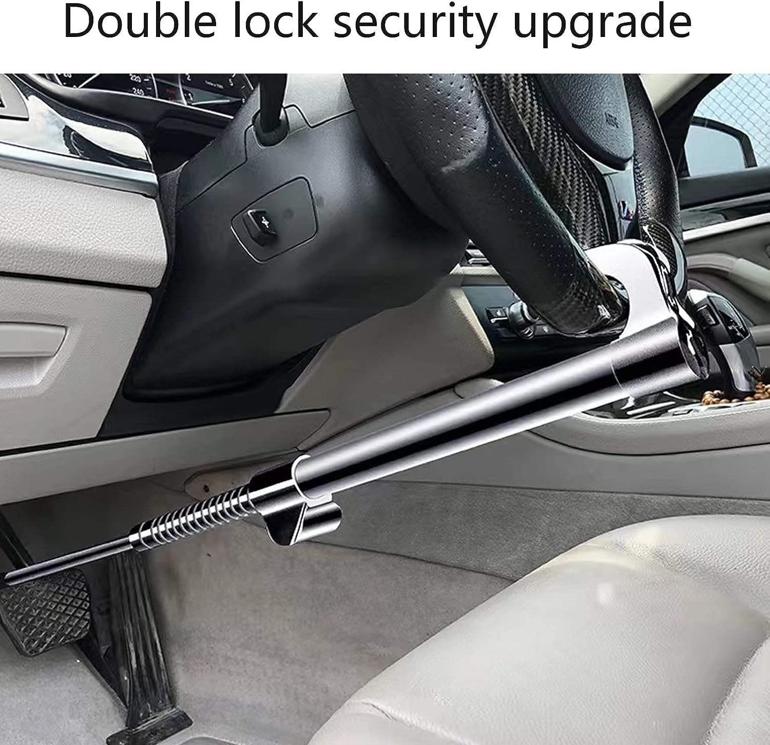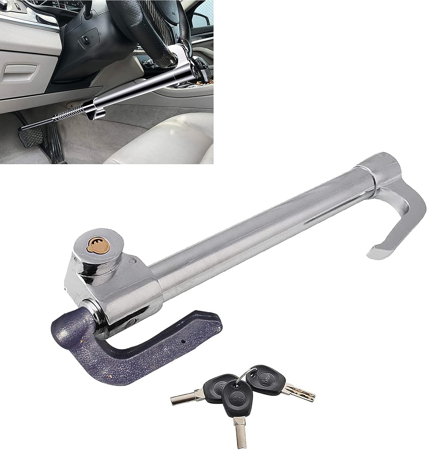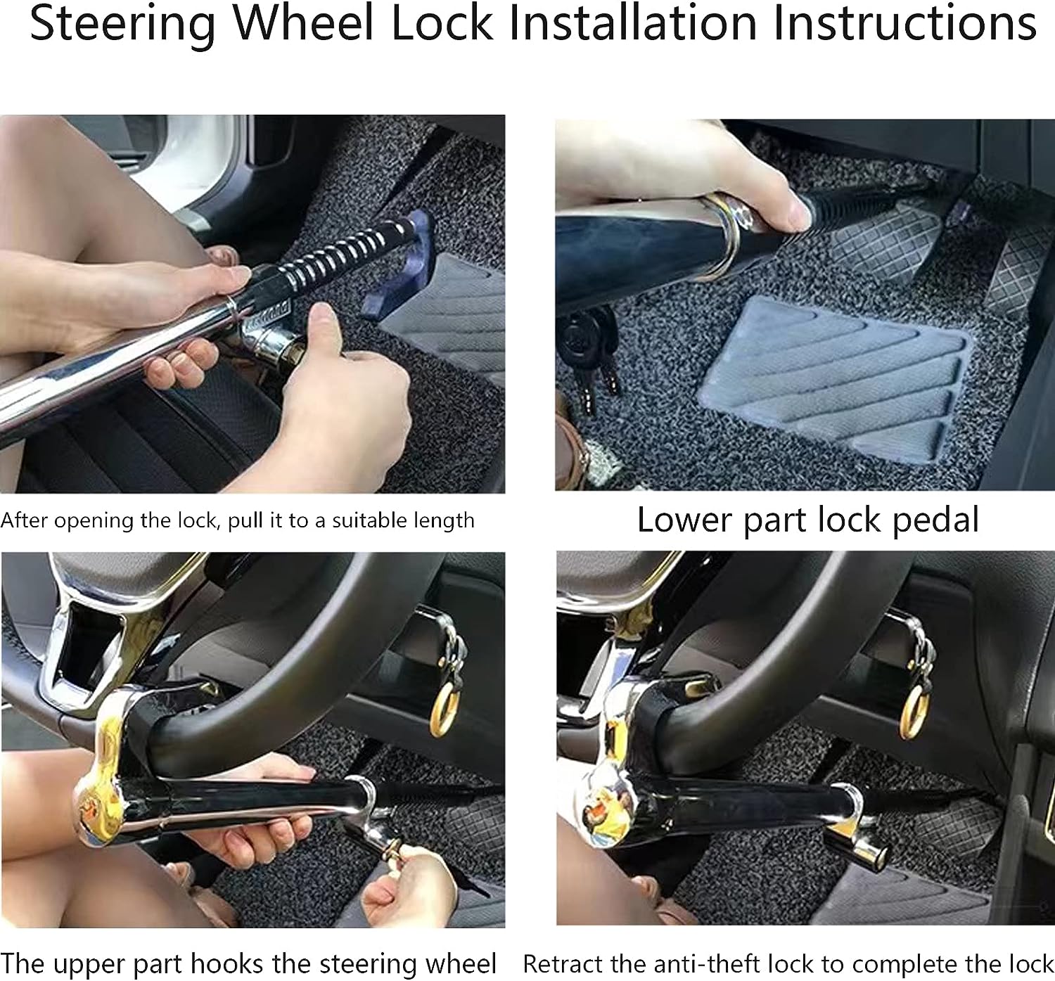 Dual protection of the steering wheel and brake/pedal/clutch prevents attempted theft of your vehicle, even if they are able to break through a door or window. Stronger and safer! It is suitable for most of vehicle models-cars, trucks, vans, and SUVs. Before we sell this product, we have done a lot of experiments. It is universal. The anti-theft device body is resistant to prying, sawing and hammering, making it more difficult to break the theft. Instructions: 1.After opening the lock, pull it up to a suitable length. Make it hook the clutch, brake or accelerator. 2.Make the metal shackle hooks the steering wheel lock. 3.Shrink the anti-theft lock until it fits tightly to complete the lock. Note: Please make sure our steering wheel locks fit your vehicle before placing an order. You can contact us with any questions!